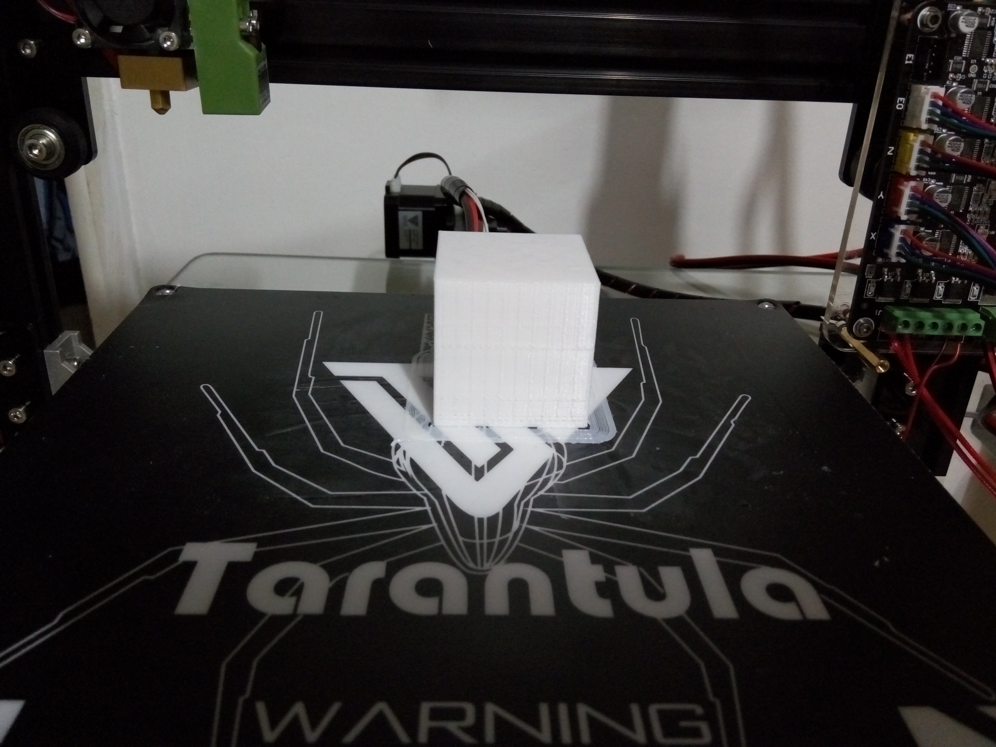 I’ve printed a 4x4x4 (cm) cube on my Tevo Tarantula. I used 30% infill and Cura defaults. Material is PLA. Extruder at 210 deg. + bed at 55 deg.