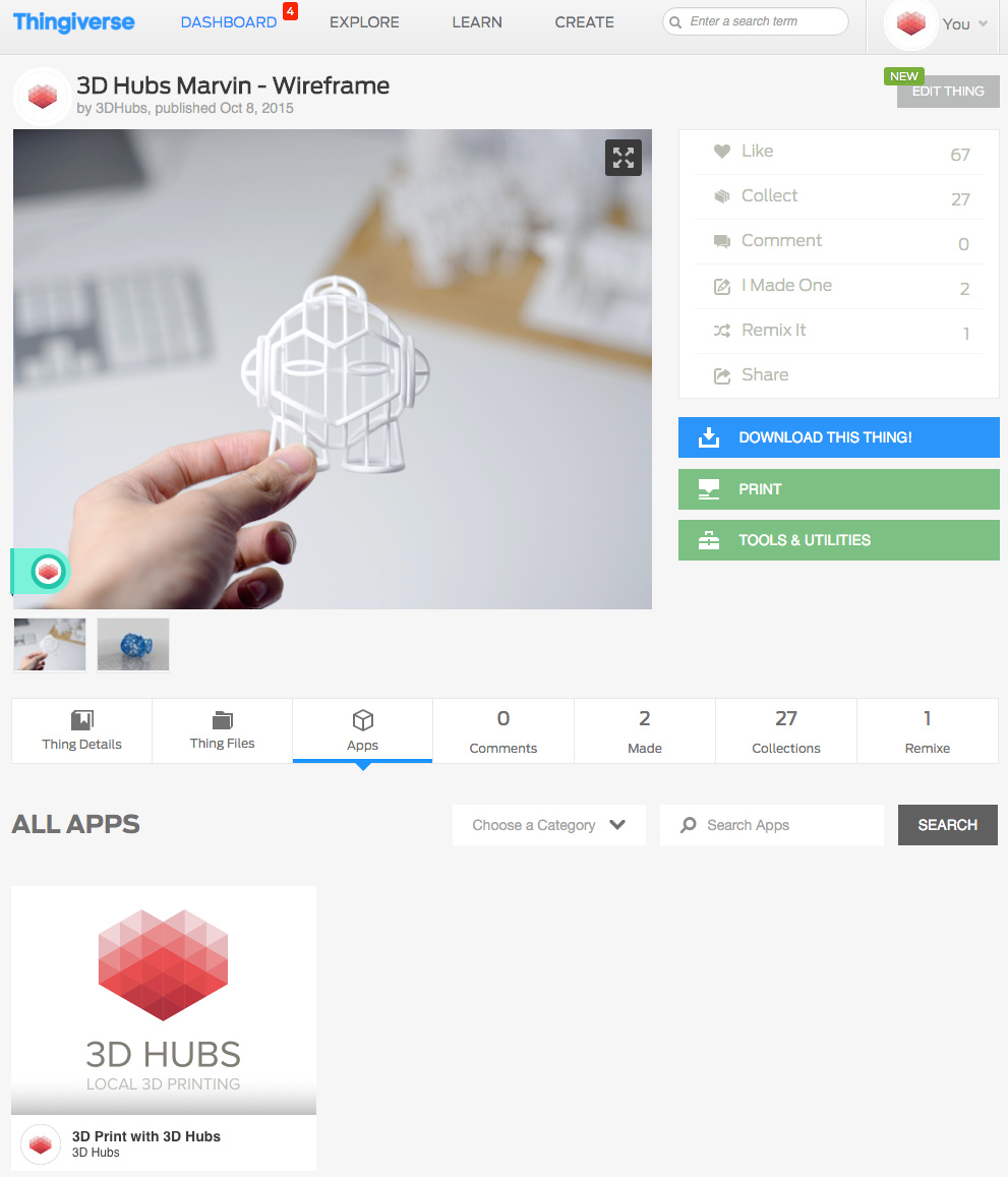 With the integration, a Print button will be added to Thingiverse designs that carry Creative Commons licenses that allow for commercial use. This allows users to directly 3D print objects from the Thingiverse website to 3D Hubs.