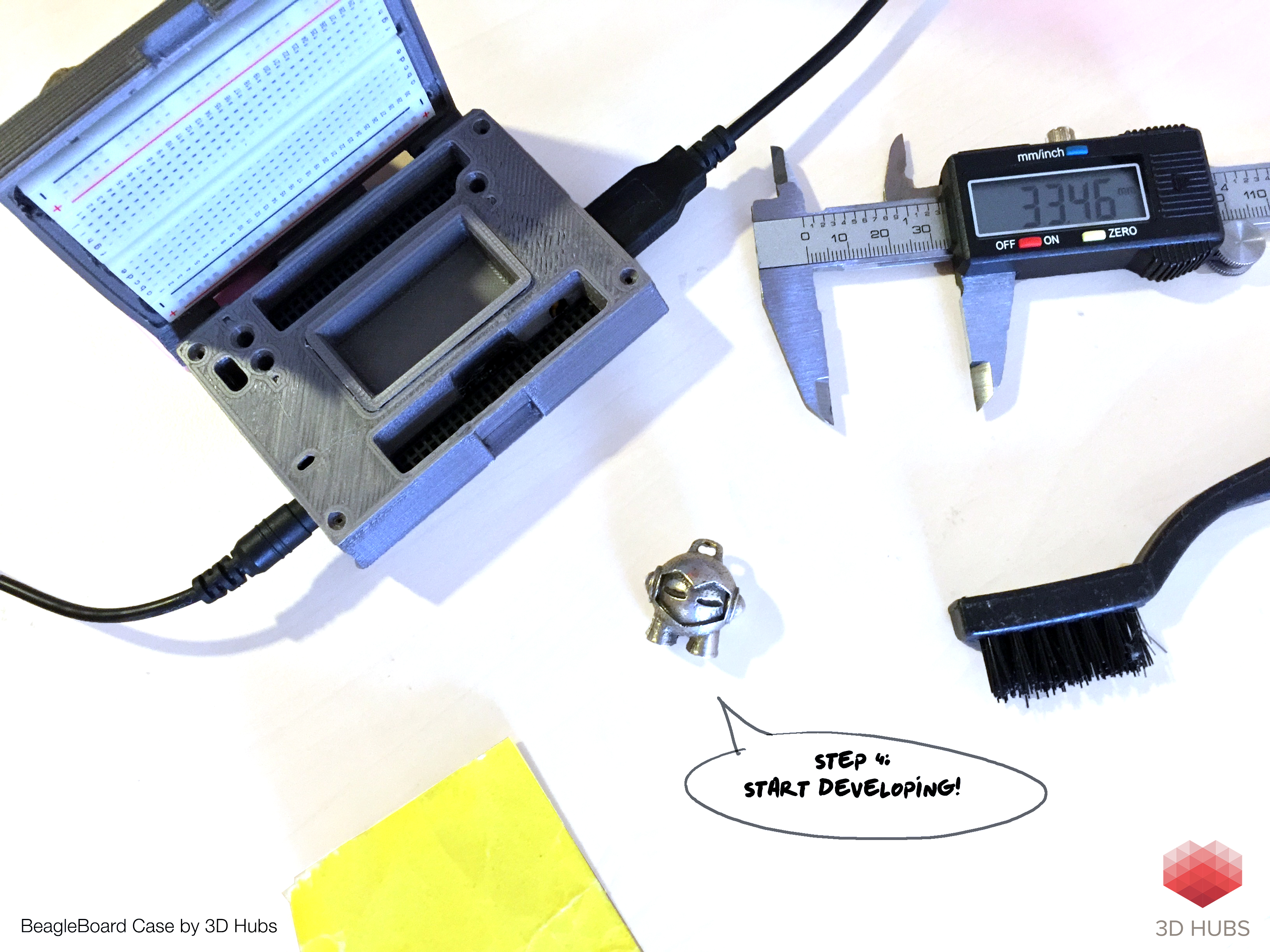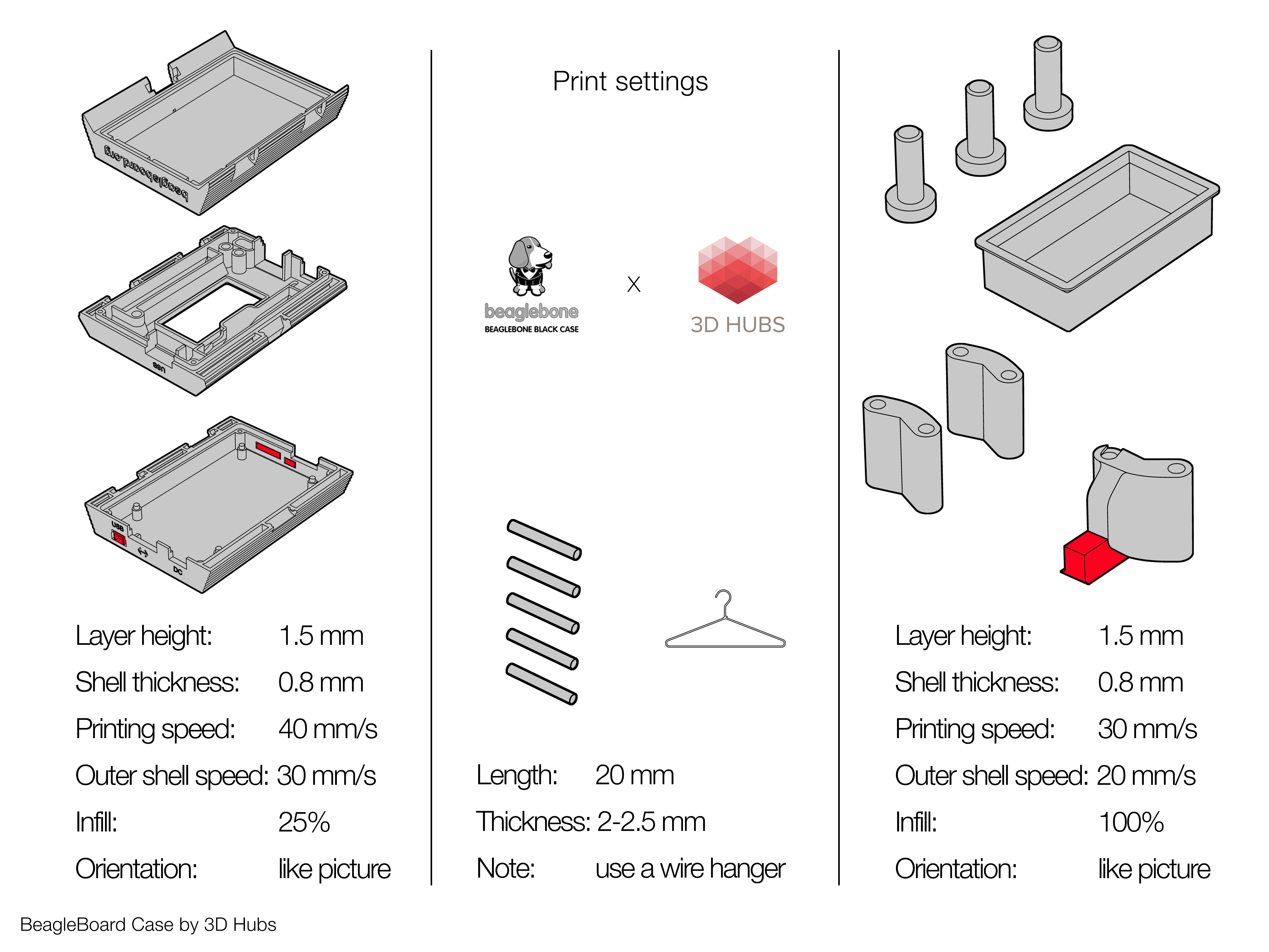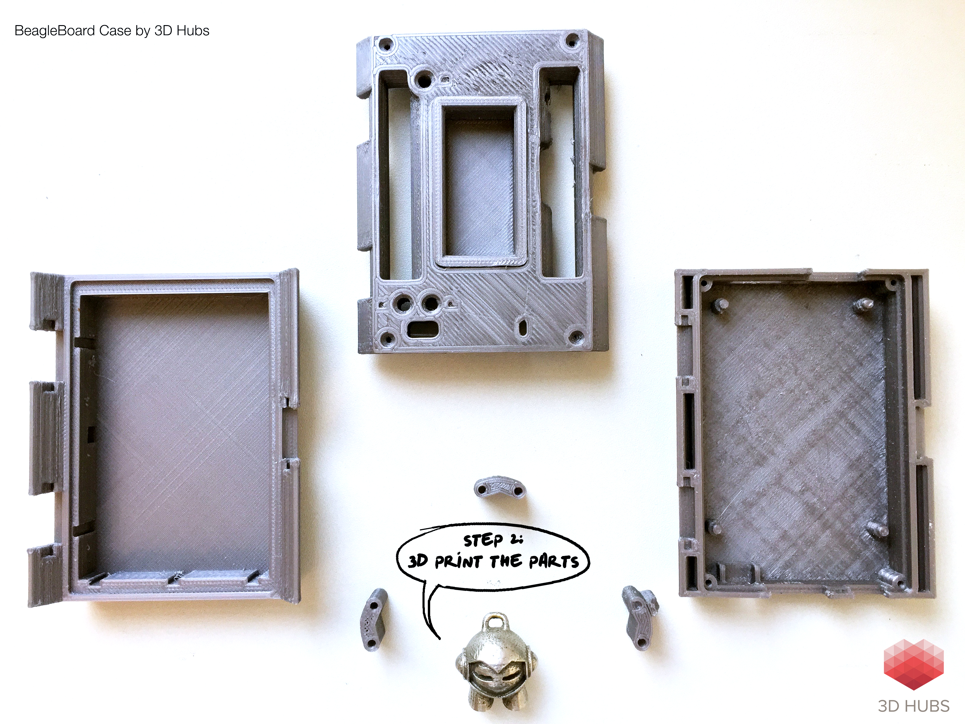 While waiting for the BeagleBone to arrive, 3D print the given .STL files. You can do this on your own 3D Printer (if you have one of course) or print it locally via 3D Hubs.