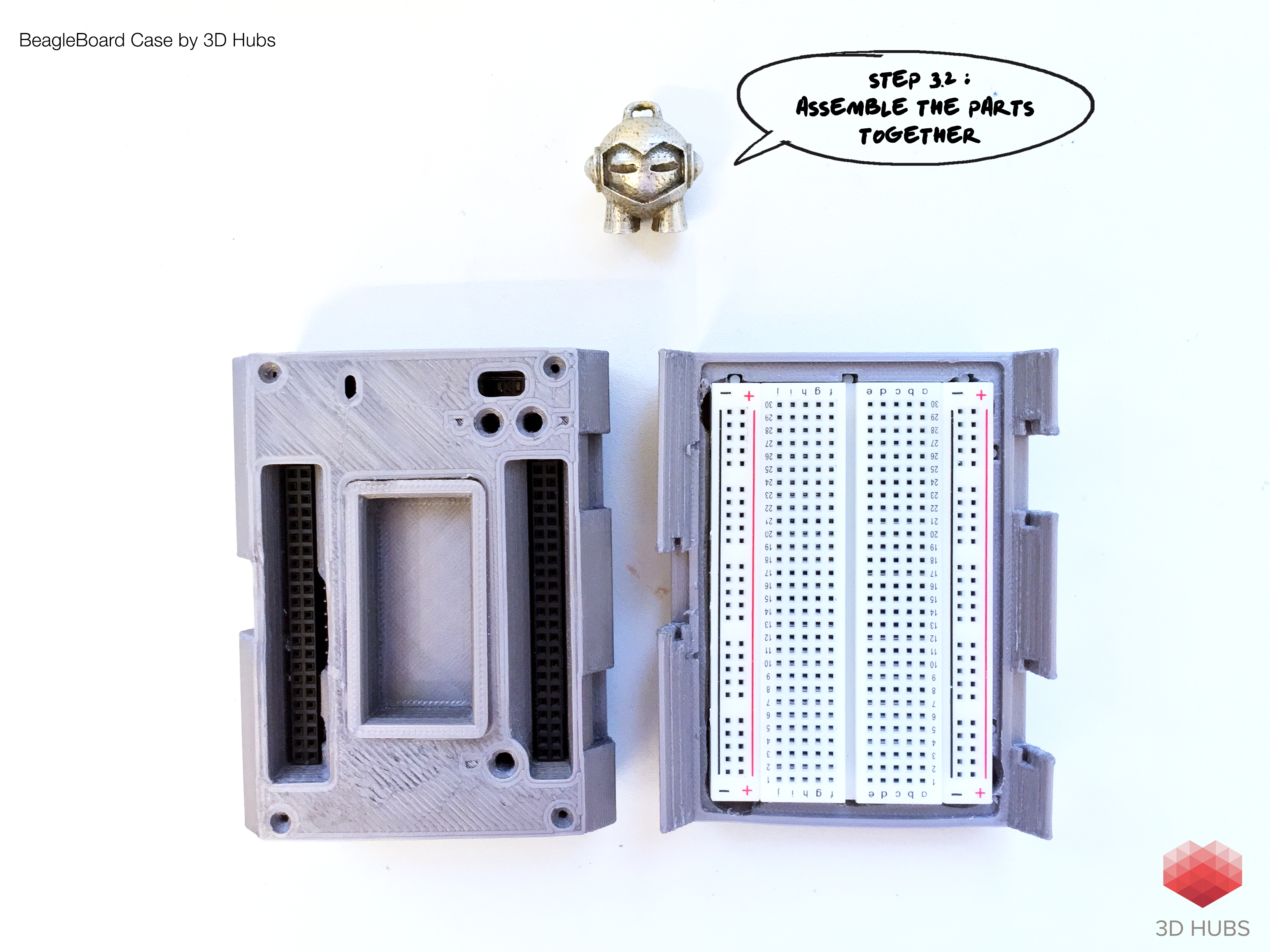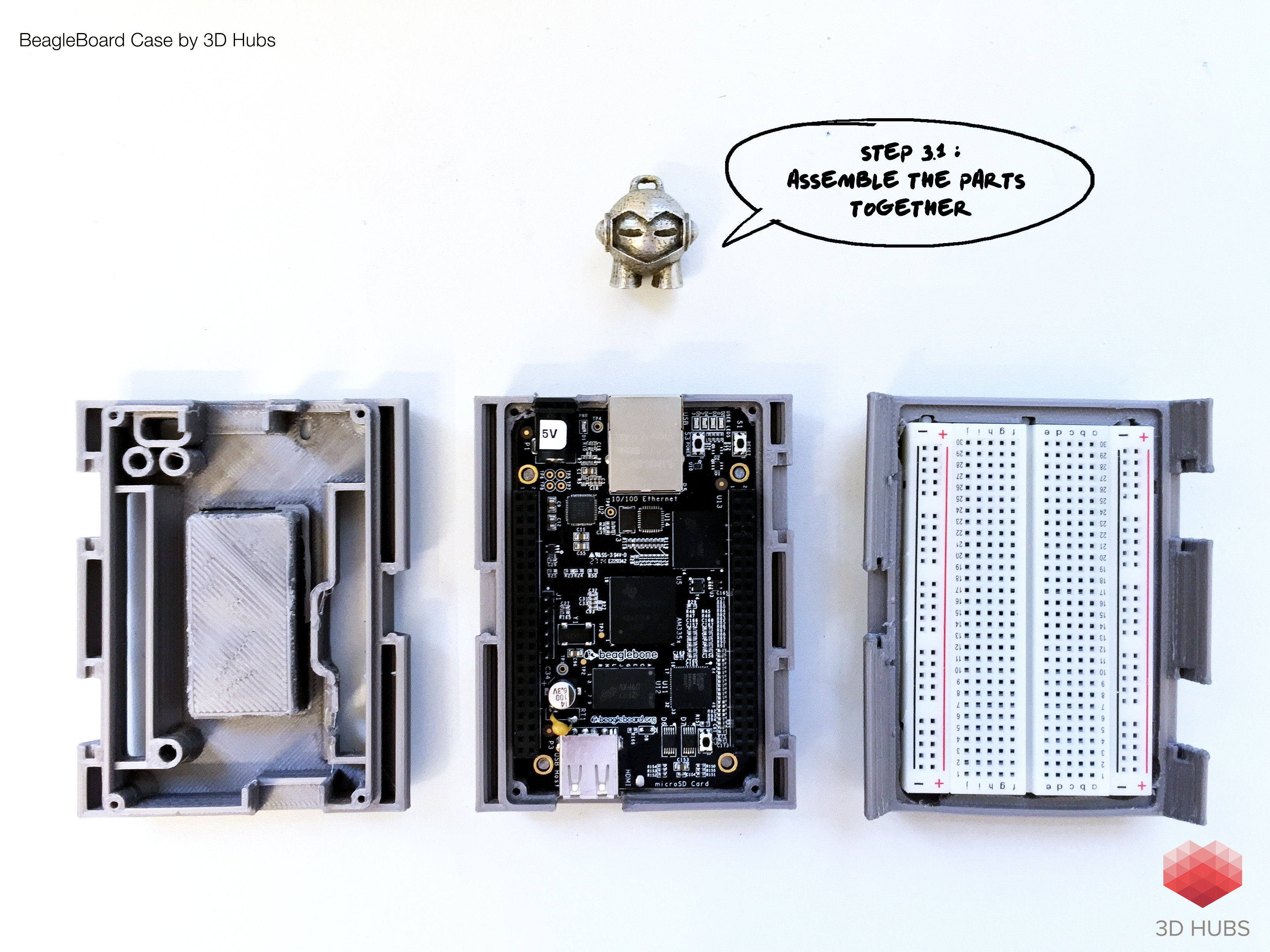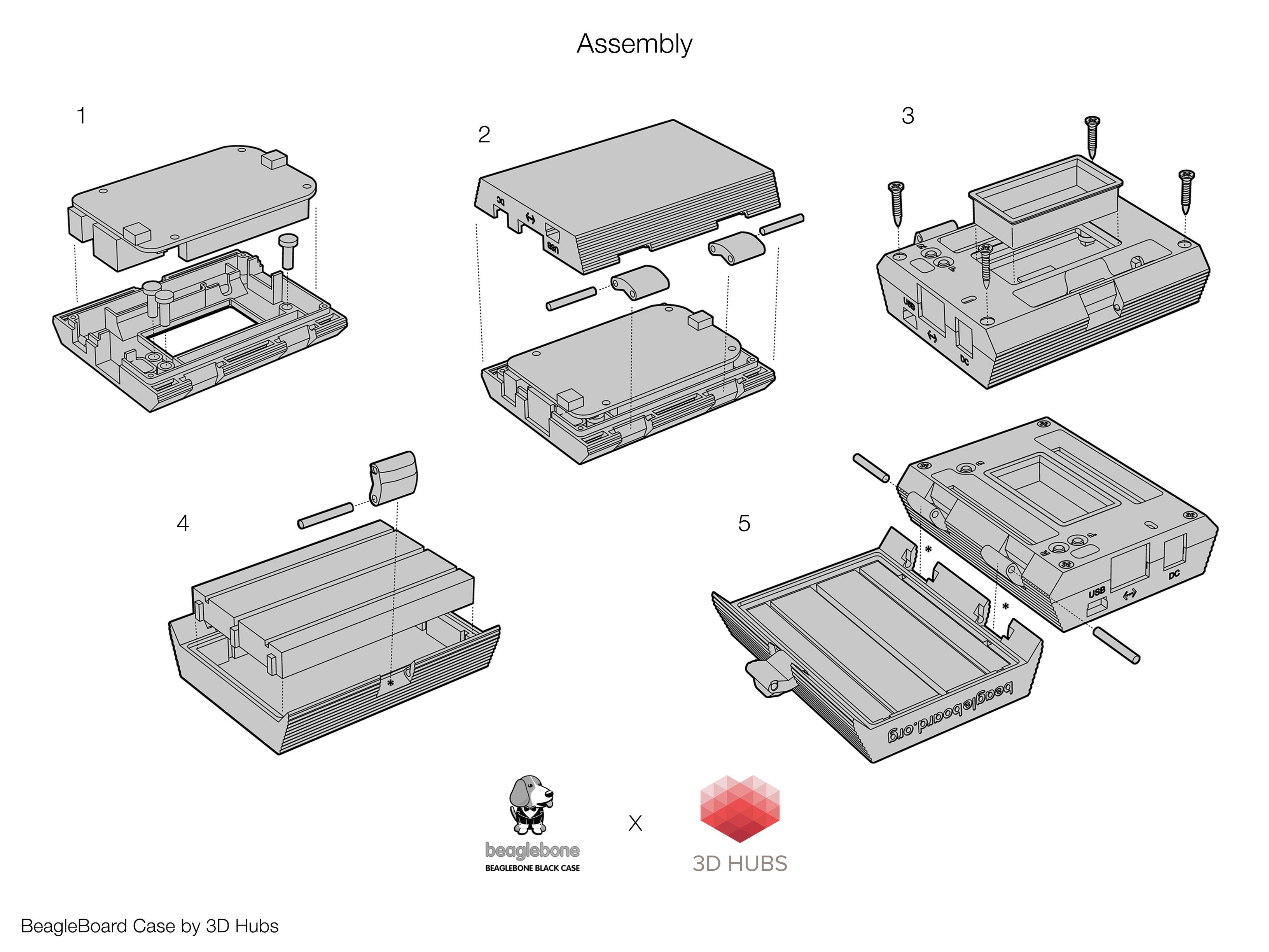 As for the assembly, it is a very easy process but it depends on your printer and whether the parts are an easy fit. On the picture below you can see different printed BeagleBones which were all a little bit different from each other, even though it was printed on the same printer. The upper left case is the exception which was printed on an SLS printer which is much more accurate, sturdy and also looks way better. This case was printed with our new 3D Hubs HD service now providing industrial grade 3D printing around the globe (totally awesome yes).