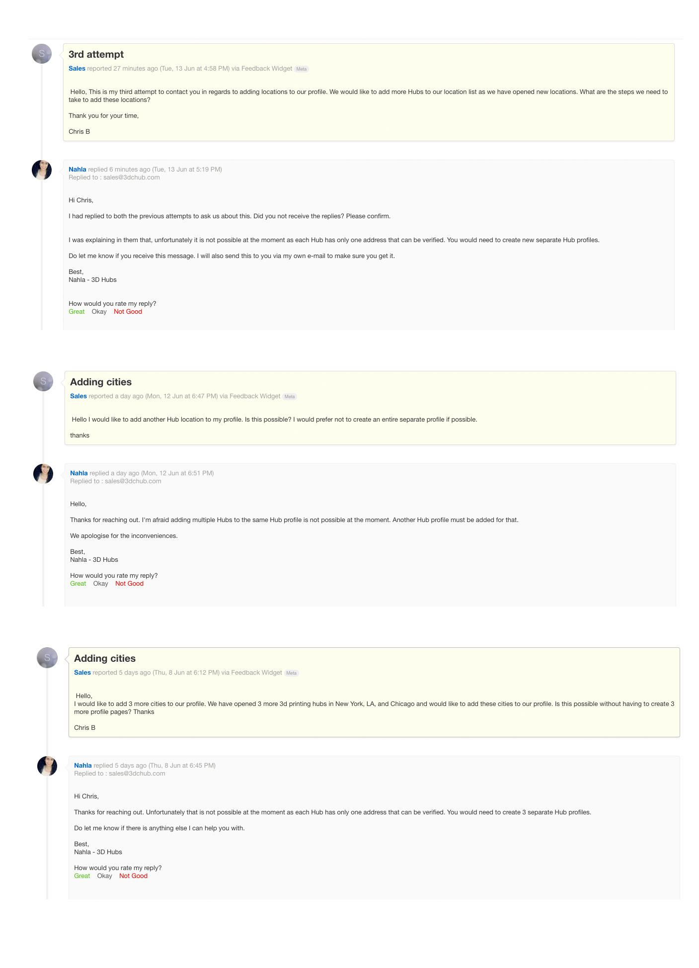 Hi, this is a Q for the 3D Hubs staff. Would it be possible to allow hubs to list at multiple locations?
