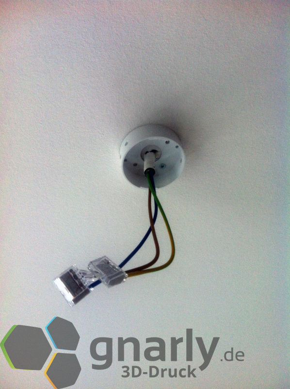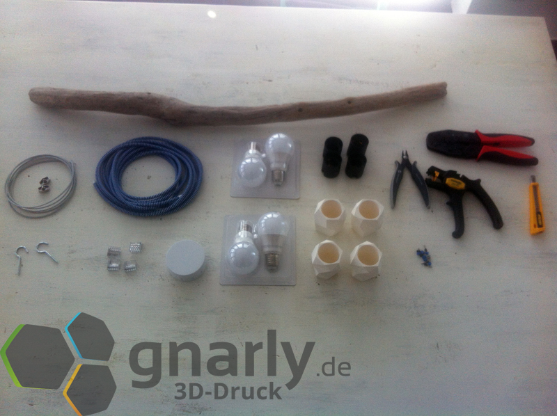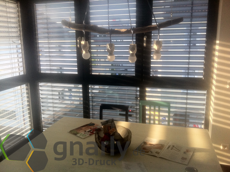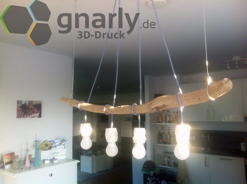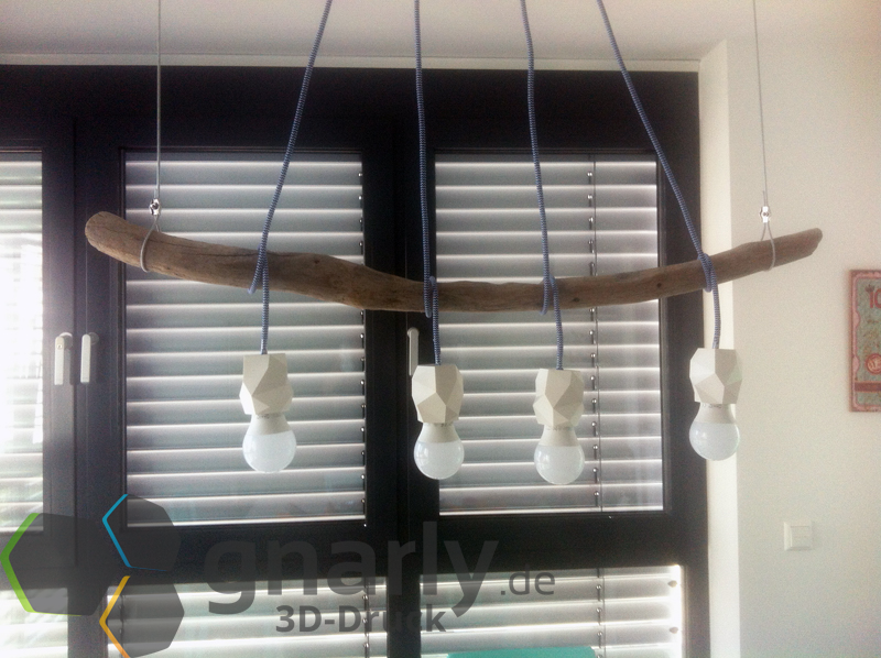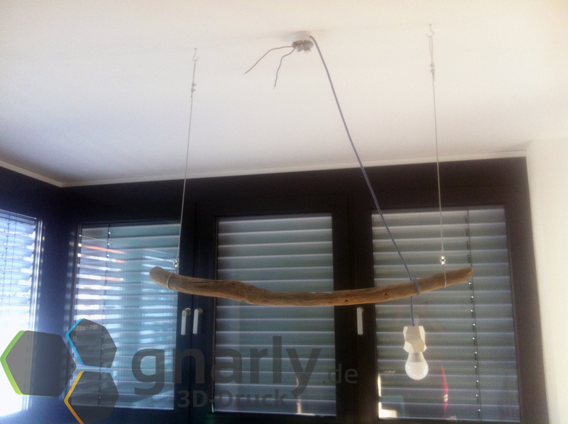 The base is a branch hanging down the ceiling with four 3D printed lamps. I used some braided cable in blue/white which look really nice! The bulbs are LED-bulbs they look nice and save power.