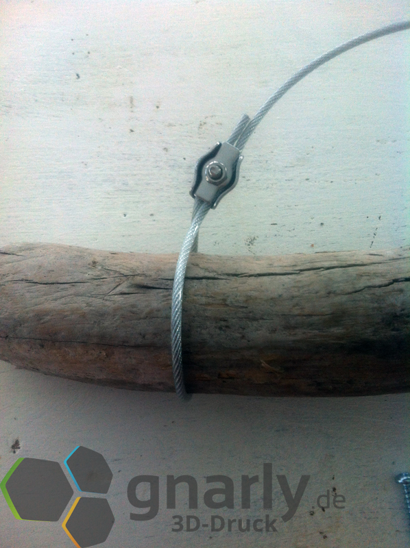The branch is mounted with a steel cable and two hooks. The steel cable is wrapped around the branch and fixed with clamps.