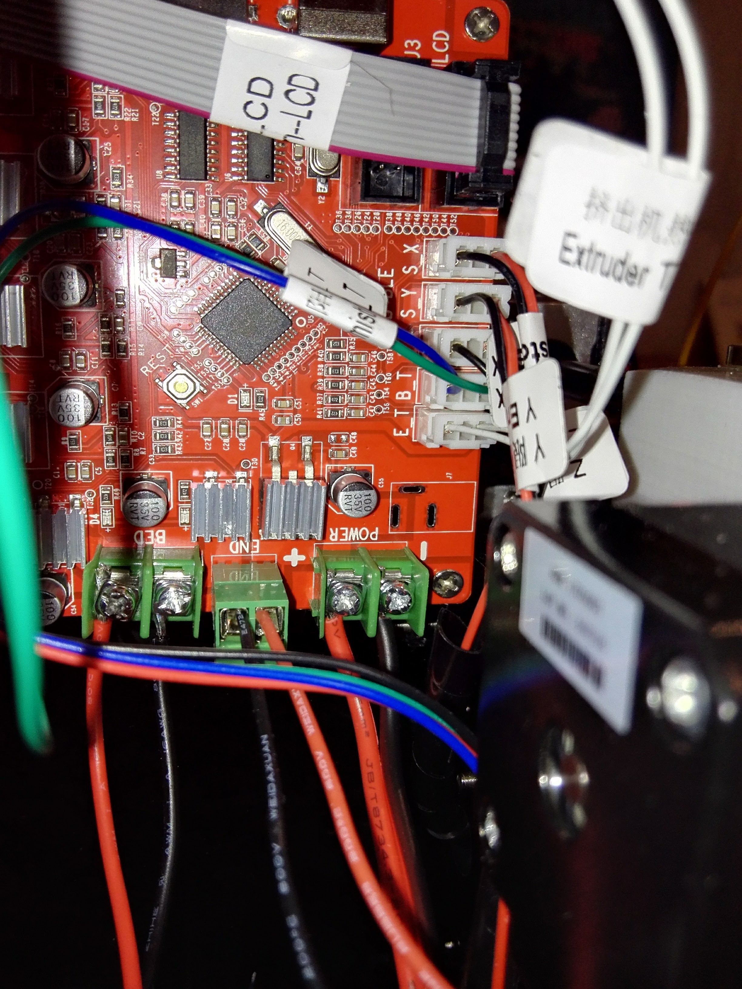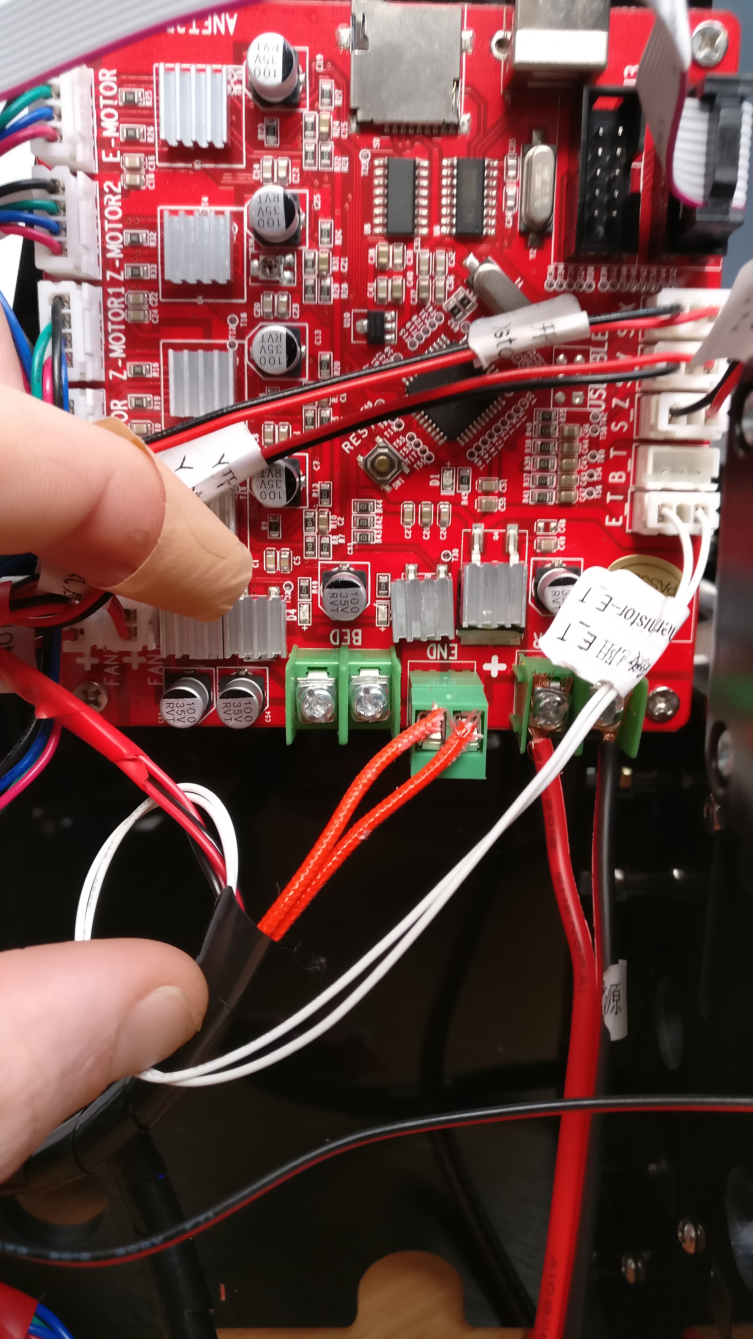- Connect motherboard left bed connector to + on heated bed with thick red wire
