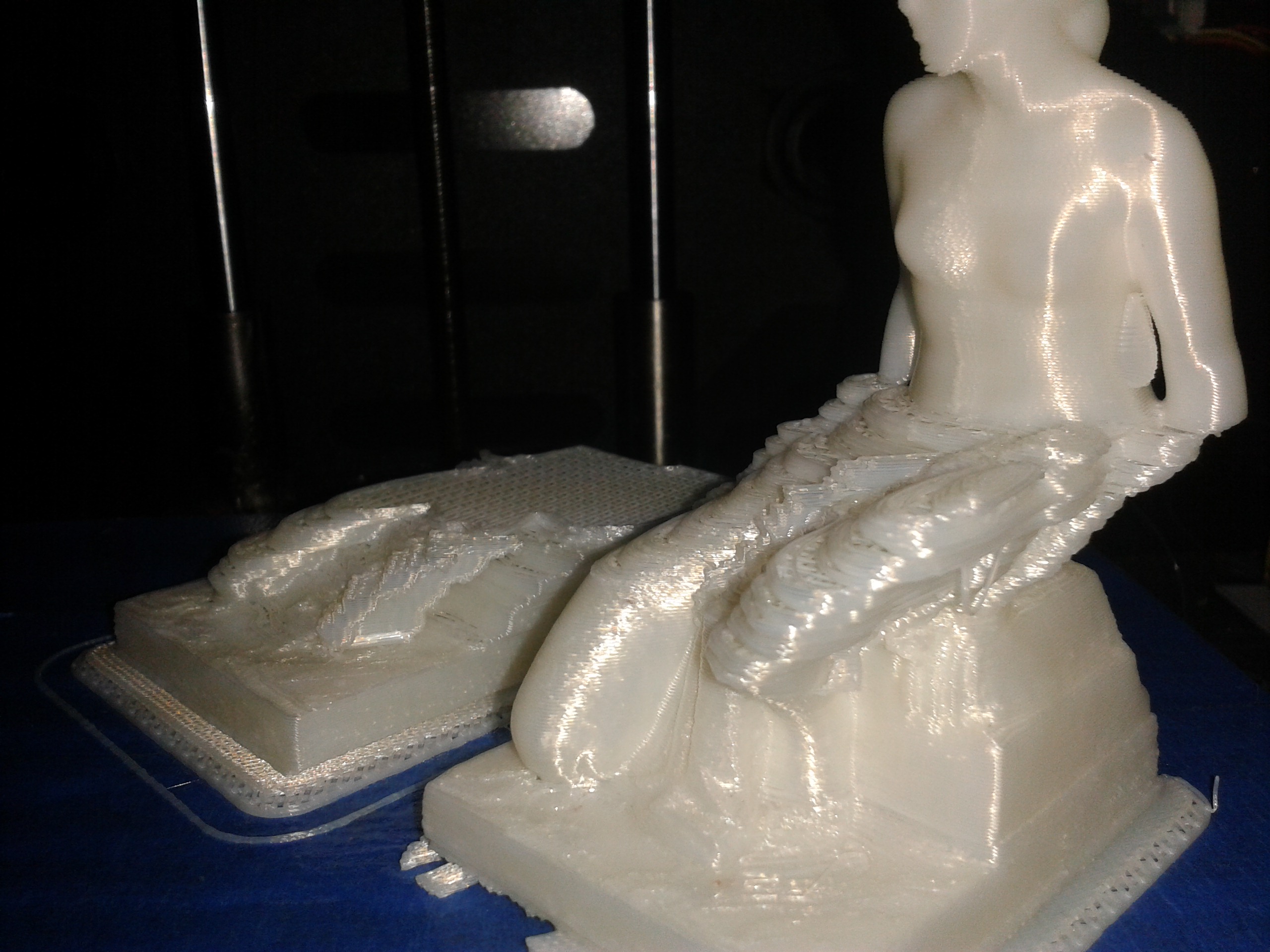 I printed one model without problem, and then this started to happen with the next one. As you can see from the attachment, the left-right axis (is this x or y?) starts skipping. The model at the front is was the first try, and then the one at the back.