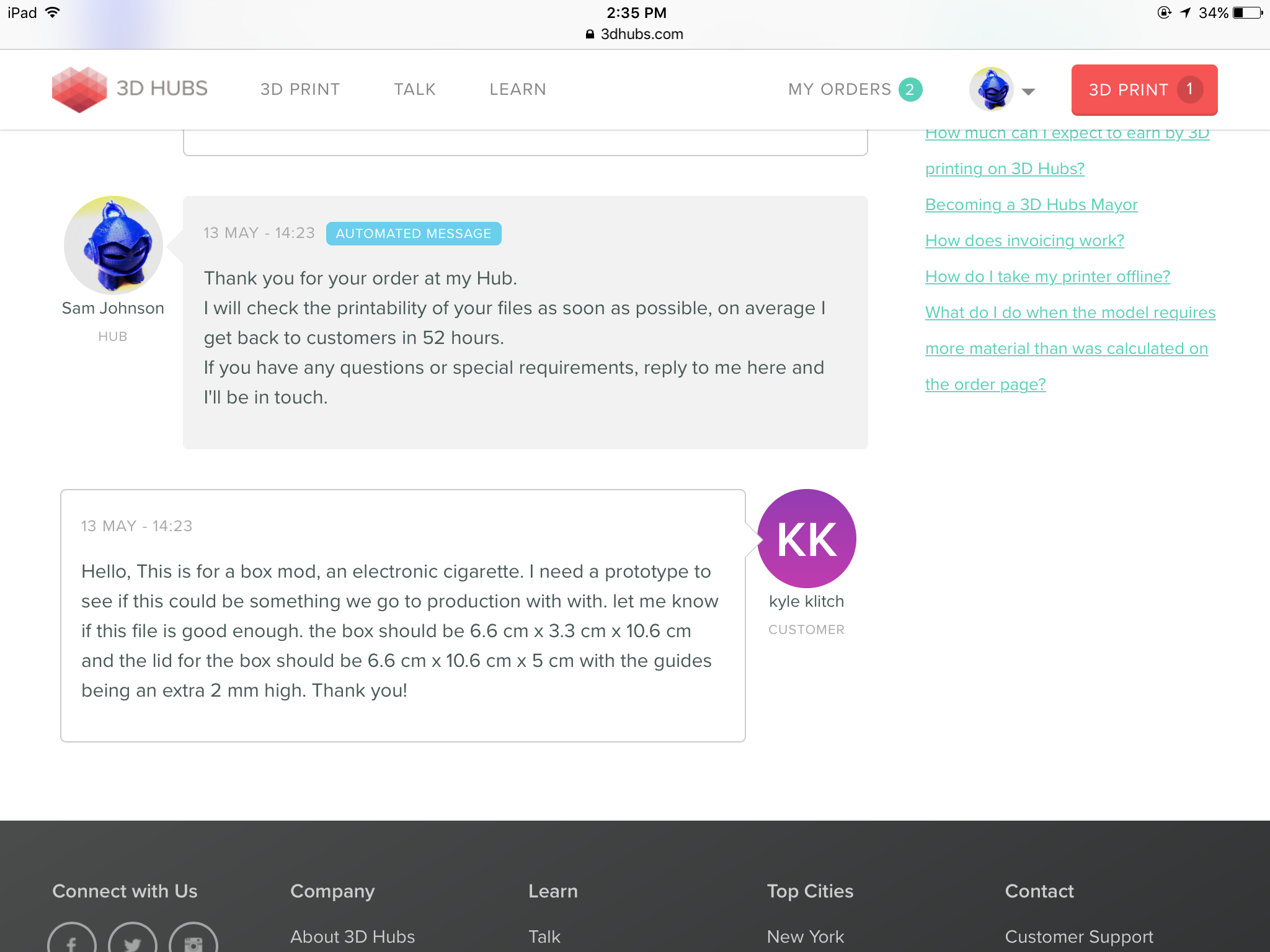 Is that for sure using the actual response time on 3d hubs? Or could it possibly be hard coded into the bot to say that, as 52 hours would be a couple days. I’ve noticed that on my hub it says in my dashboard that it would appear as ‘within the hour’ but on my actual hub it says two hour response time, despite my time being about 30 minutes. Also ive noticed sometimes 3d hubs texts me saying I haven’t responded to customers in hours when in reality I often already have ample time before the message. Could be related or could be totally separate problems, regardless I hope this input helps and wish you best of luck!
