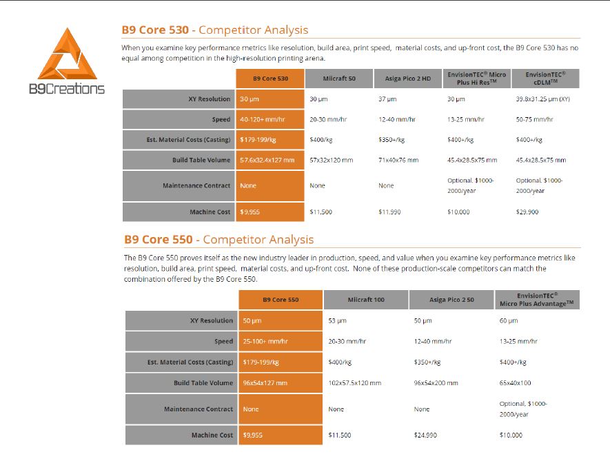 Here is a comparison chart for the Envisontech and B9 Core Series printers. Please let me know if you have any questions. Thank you.