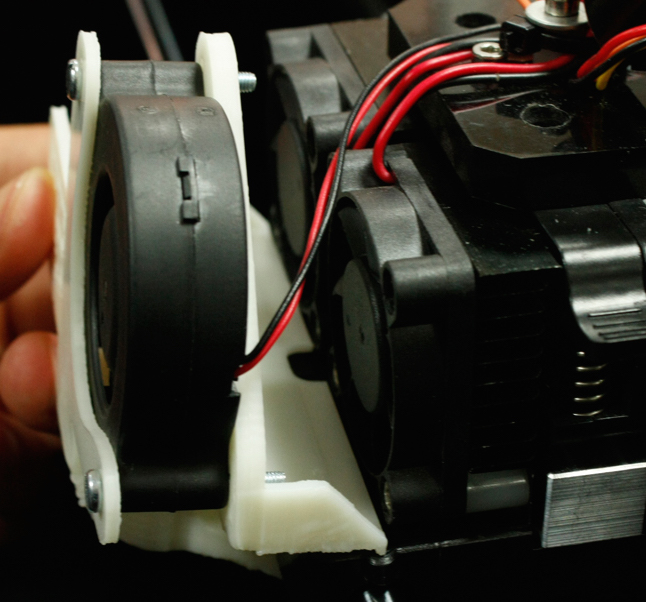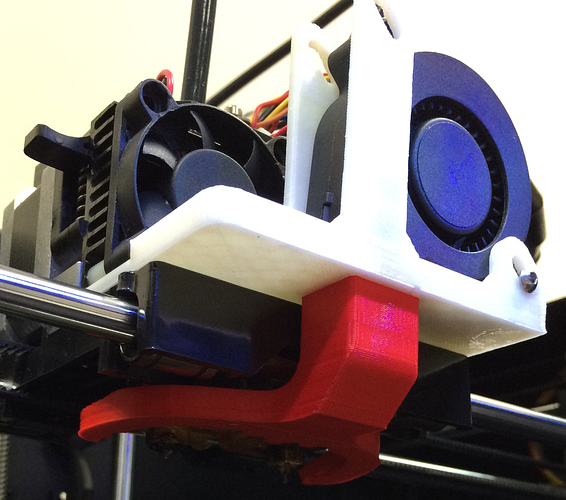 I’ve been using this: Makerbot Replicator 2x Filament Fan Duct w/Magnets!! by pwnate - Thingiverse