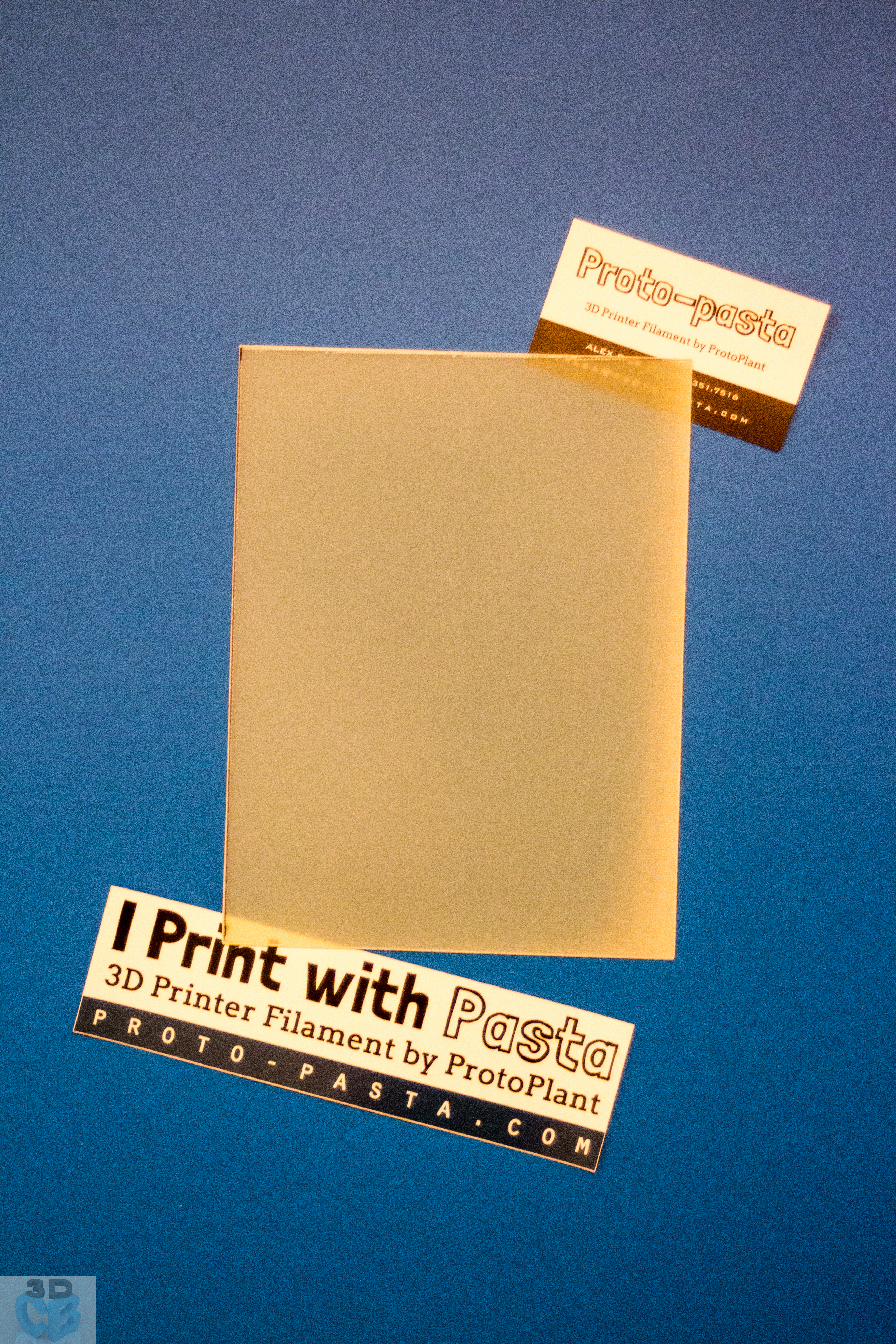 Proto-Pasta’s newly released build plate has many similarities to Fleks3d, both are a thin plastic-like sheets that that are directly applied to your build plate which can be fastened on with binder clips and allow the user to pop the print off with a single bend of the plate but they start to differ from there. Proto-Pasta’s build plate allows you to print with heat applied on your bed, for example if you are using a stock XYZPrinting Da Vinci you cannot turn the heated bed off, Proto-Pasta’s plate will not warp due to the heat like Fleks3d will. Another difference I have noticed is that with Proto-Pasta’s plate they ask that you still use your favorite adhesion method, whether tape, glue stick, or Kapton tape where Fleks3d doesn’t require any extra adhesion. As seen on Proto-Pasta’s site they actually applied BuildTak to their build plate and were able to pop the print off their bed with little effort. Which does make a good combination!