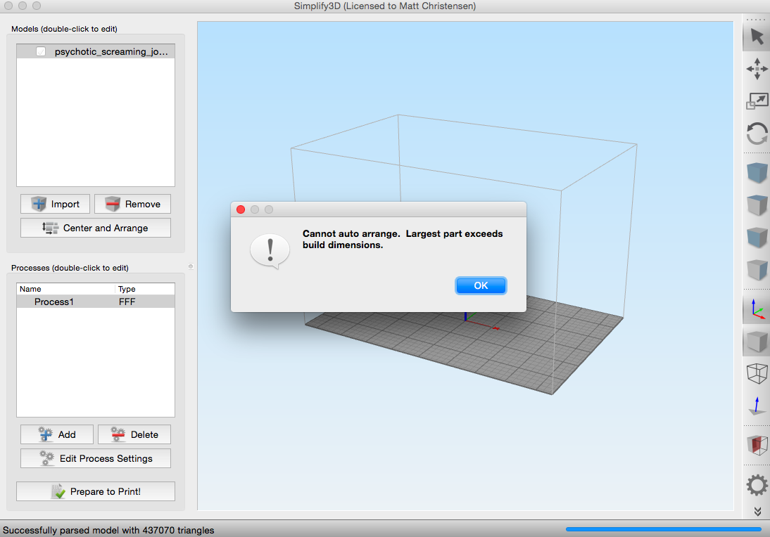 I just purchased the Simplify software less than an hour ago. It’s already crashed on me five times, and I keep getting an error message that says “Cannot auto-arrange. Largest part exceeds build dimensions.” whenever I try to import a model. All of the models I’m trying to import have been printed before on my printer with SLIC3R, and with no problems - the most recent one is only about 3 inches high, and 3 inches wide, and 3 inches deep, if that. I wanted to get Simplify to up my game a little bit, and play around with the vast options. The program crashes when I attempt to “Center and arrange” the models manually. I get the rainbow wheel (I’m on a MAC), and then have to Force Quit. I’d like to know what the problem is.