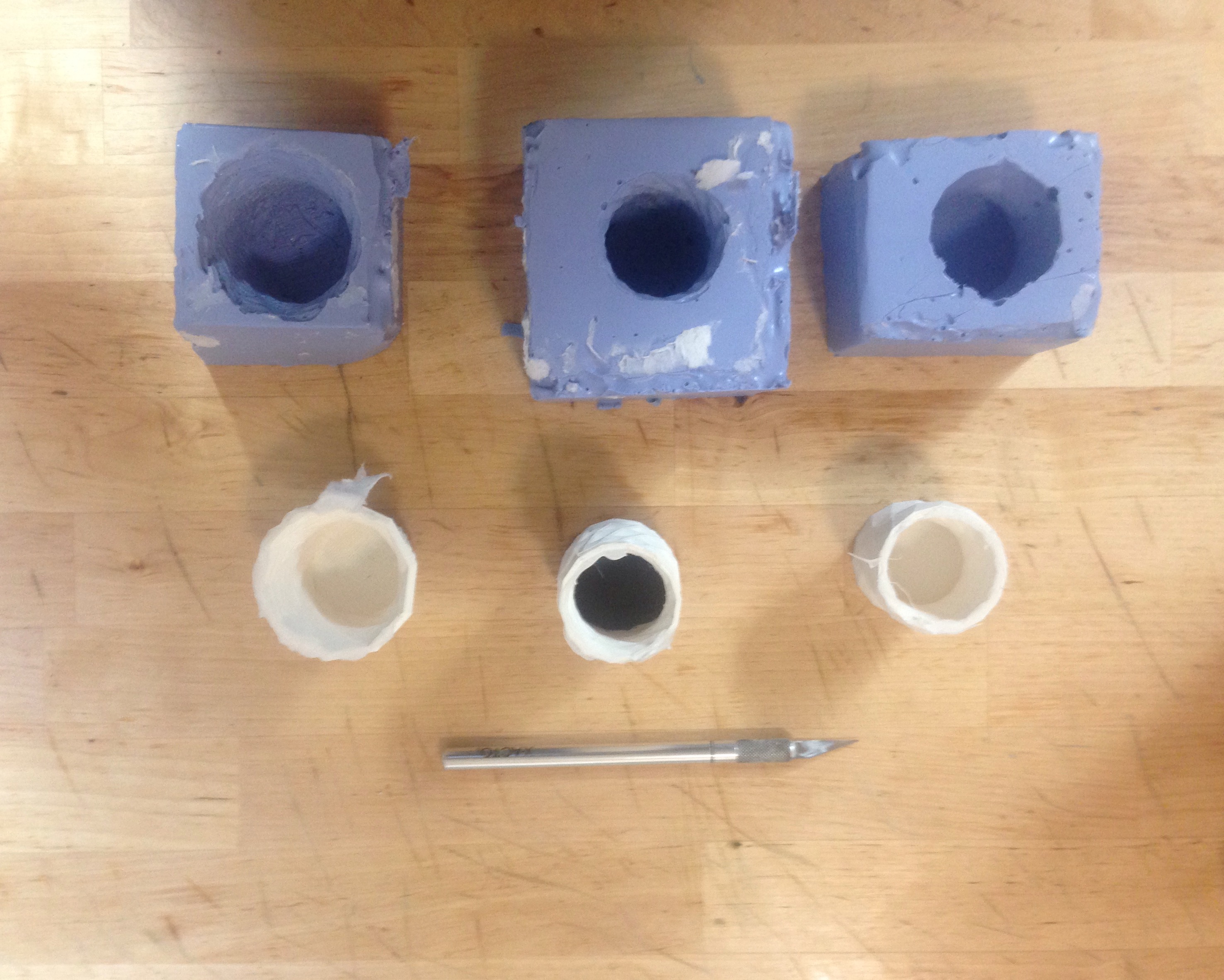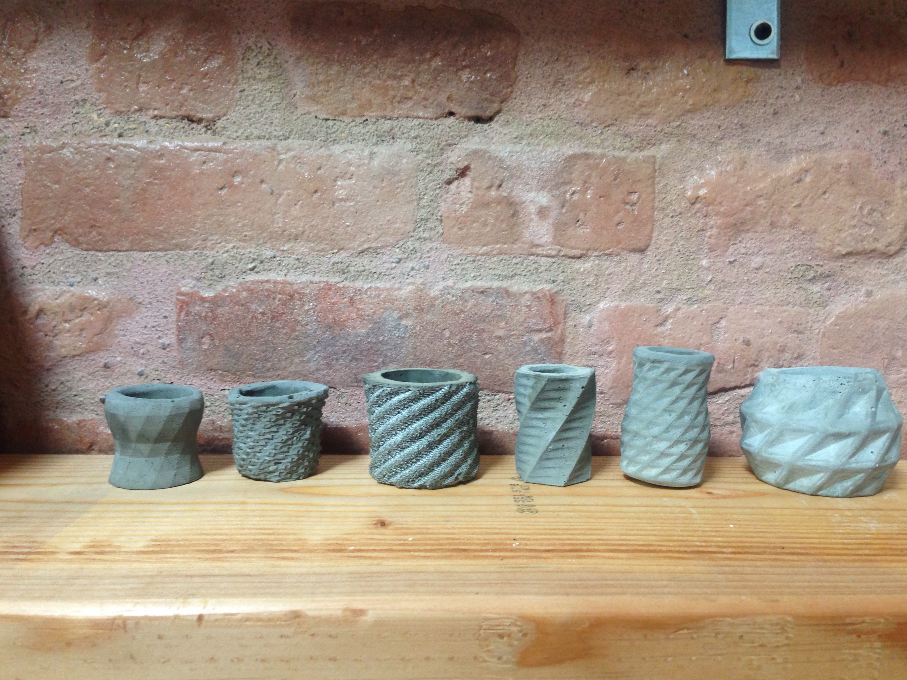 I’ve recently been experimenting with some casting of 3D printed parts and I thought I’d share the results. Below is a picture of my first batch of concrete vases from 3D printed designs.