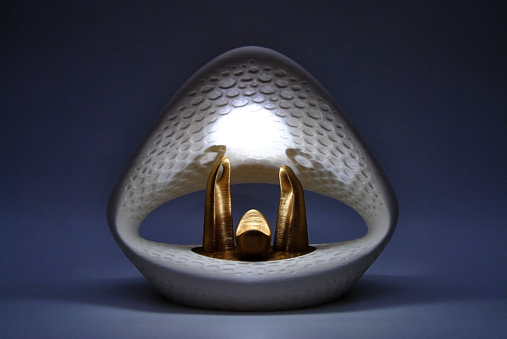 I would like to share with you my latest project. I decided to create a modern vision of the tradicional Christmas Crib, using a more minimal and contemporary shape language. To create a scenographic effect I inserted a small white LED powered by a small 12V battery hidden inside de crib. The project was printed in an Ultimaker 2 using Innofil3D white PLA filament at 200 Micron. For the golden effect, I used a spray can.