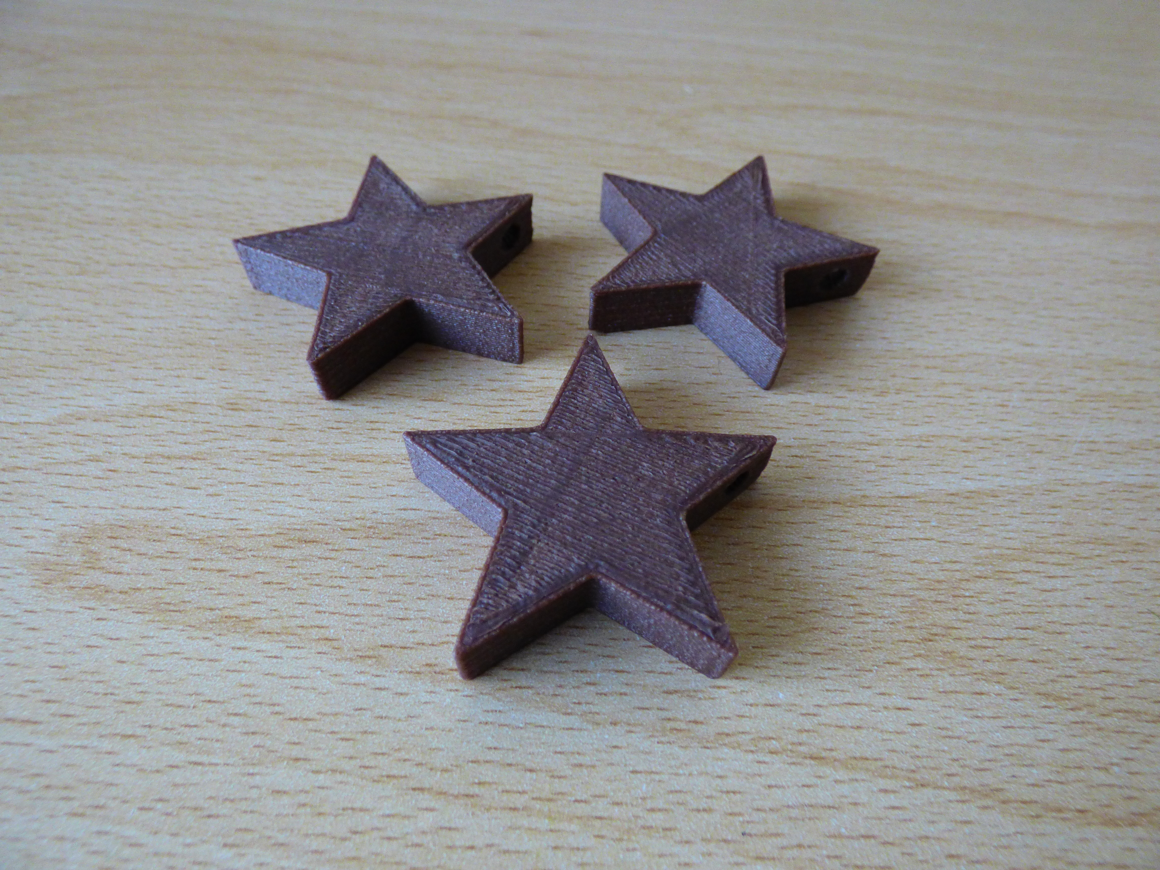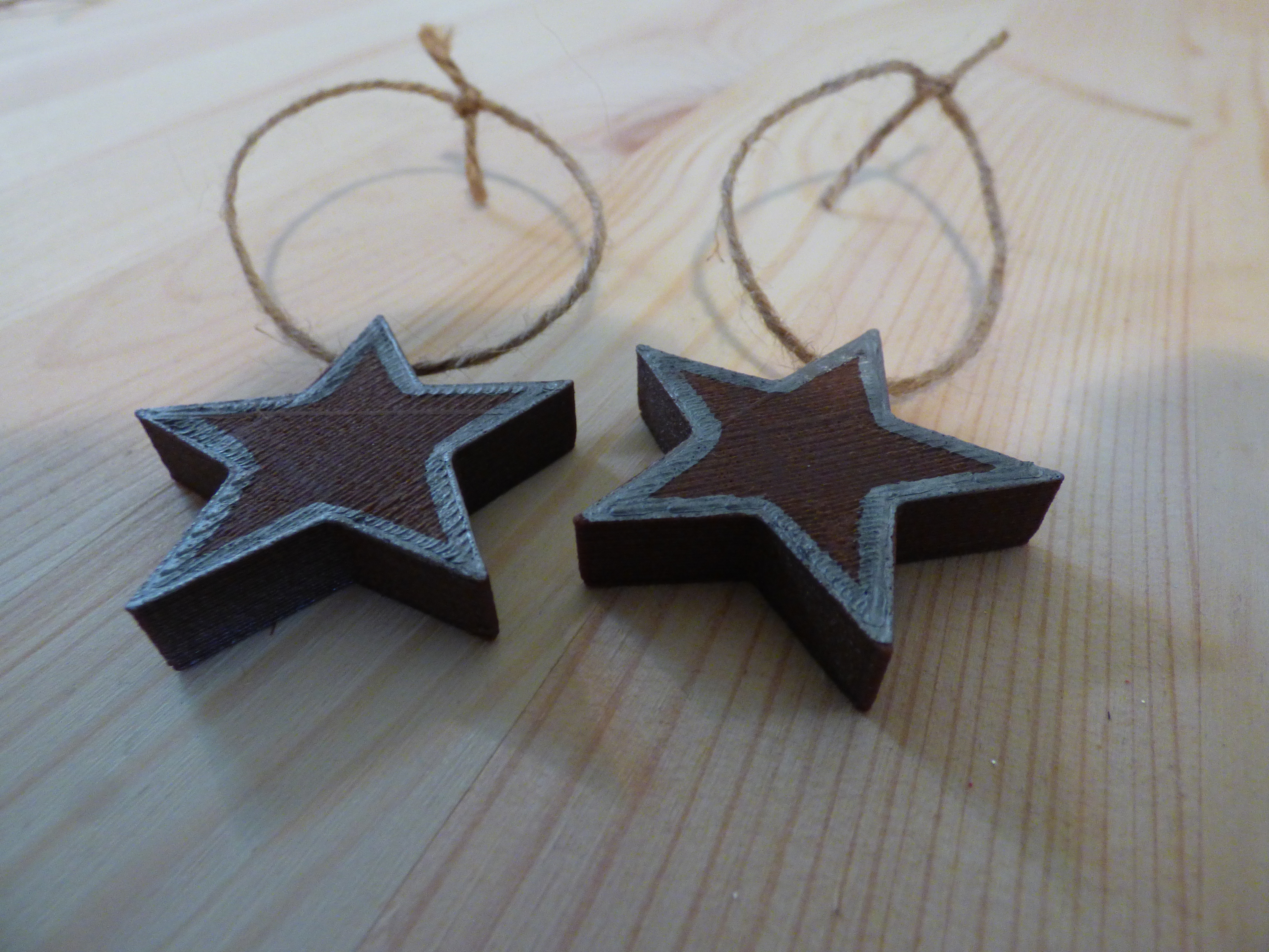 I used OpenSCAD to quickly throw together a little star shape with a little circular hole so it can be hung from a tree or on a string or ribbon. Definitely not the most complex or unique of designs, but the classics work just as well, right? Originally I’d planned on just printing it in normal PLA (maybe red or gold), but I recently received my latest ColorFabb order (thank you Cyber Monday…) containing BambooFill and CorkFill, so I ended up printing them out using CorkFill.