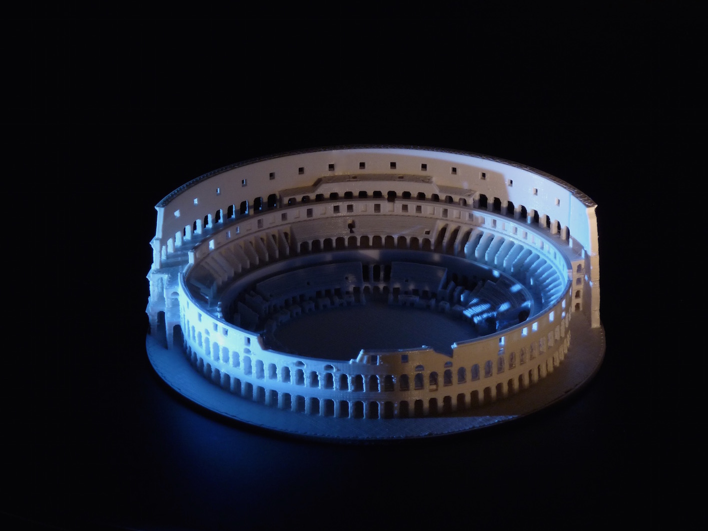Printed the Colosseum with PLA polar white. 6.08 h, 93 grams, 207 layers. The filament got stuck twice, so the Robox paused and I manualy had to continue the printing. First attempt. To give you an idea of the printsize; plateau aprox 15cm, height 4cm