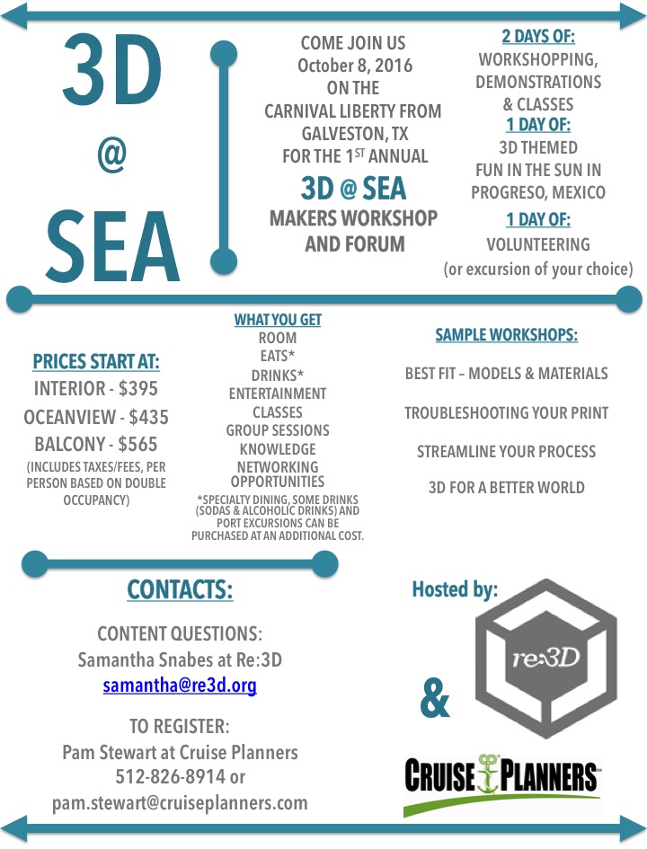 Hello, My name is Pam Stewart and I am the organizer of a “first of it’s kind” workshop for 3D Makers and Designers! This workshop will actually be held onboard the Carnival Liberty out of Galveston, TX from October 8th through October 13th (Columbus day weekend). On this 4 night cruise to Mexico we will be hosting 2 days of workshops and training seminars. We will also host a charity event in Cozumel where we will be inviting our makers to participate by bringing a 3D printed item with them to give to a school for the disabled (things like tactile books for the blind, utensil grips, canes, toys, etc.). For the last port day, in Progreso, Mexico, we will also host a 3D printing themed beach party.