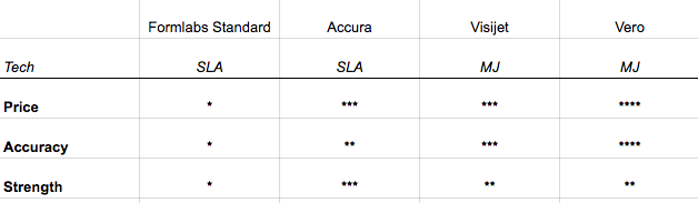 For this example, let’s assume we take Desktop SLA (say Formlabs Standard Resin, let’s go for white), industrial SLA (say 3D Systems Accura Xtreme White), Multi-jetting (3D Systems Visijet RW), and Polyjet (Stratasys Vero White).