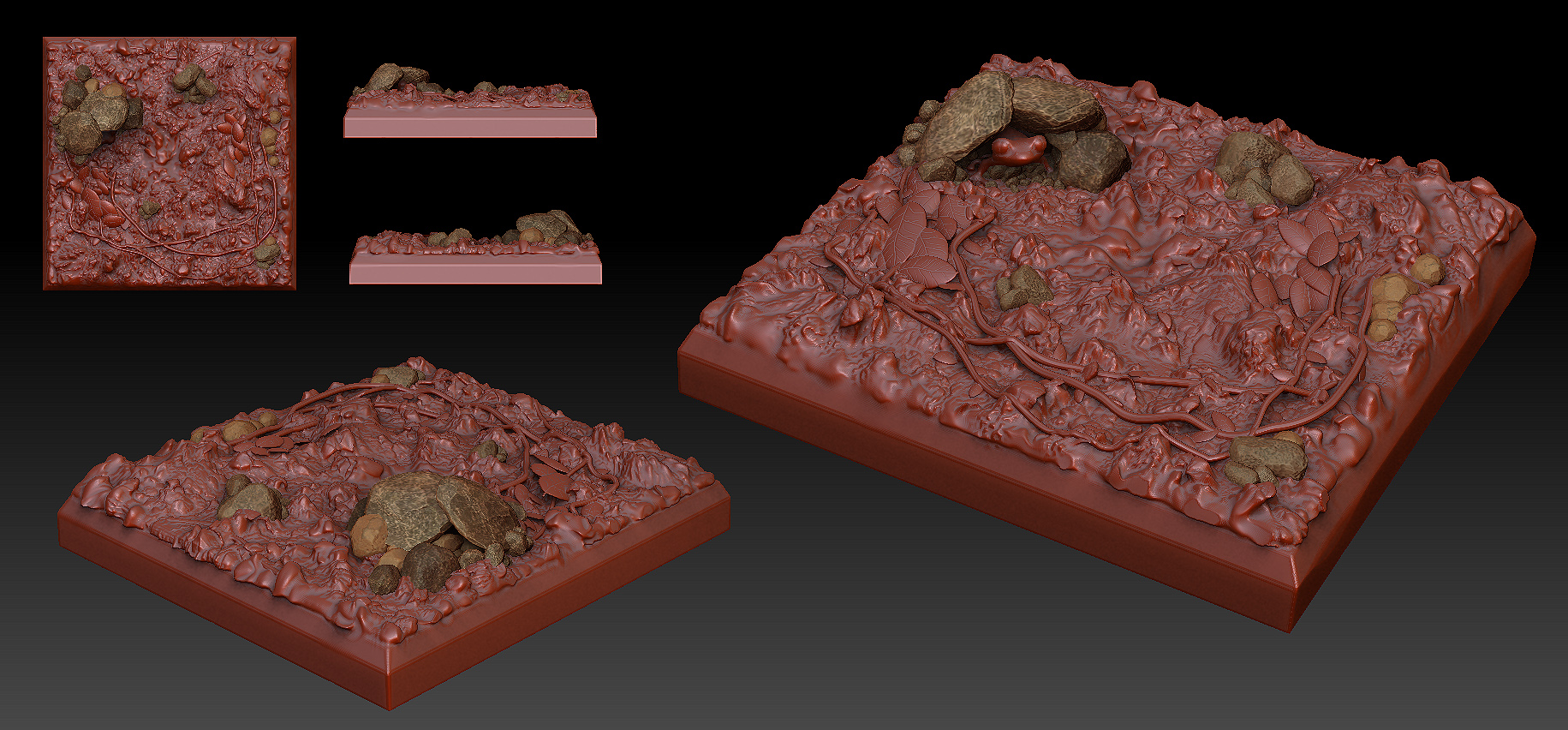 I had to come up with approx. 6 to 9 different versions of a base and the theme here was supposed be ‘Jungle’. The base size was 25x25x1mm, 40x40x1mm and also 1 50x100x1mm. So I also had to make some different sizes. I made base-meshes in Modo because it’s really easy to setup size and get the same look and feel as a real-life base.
