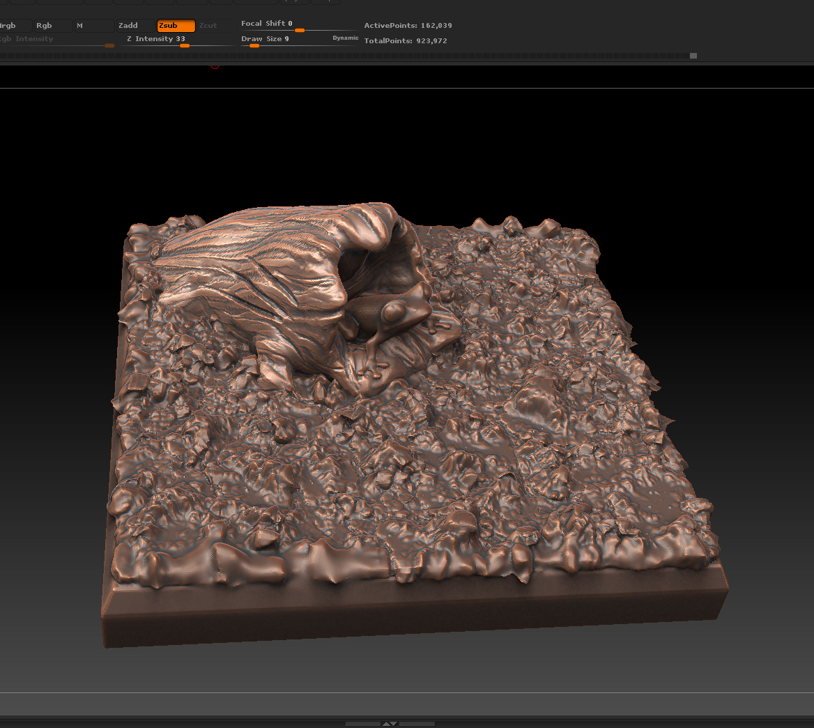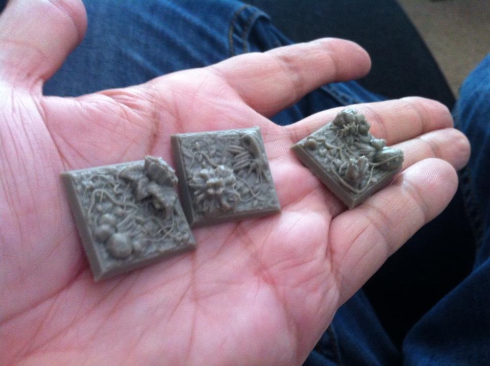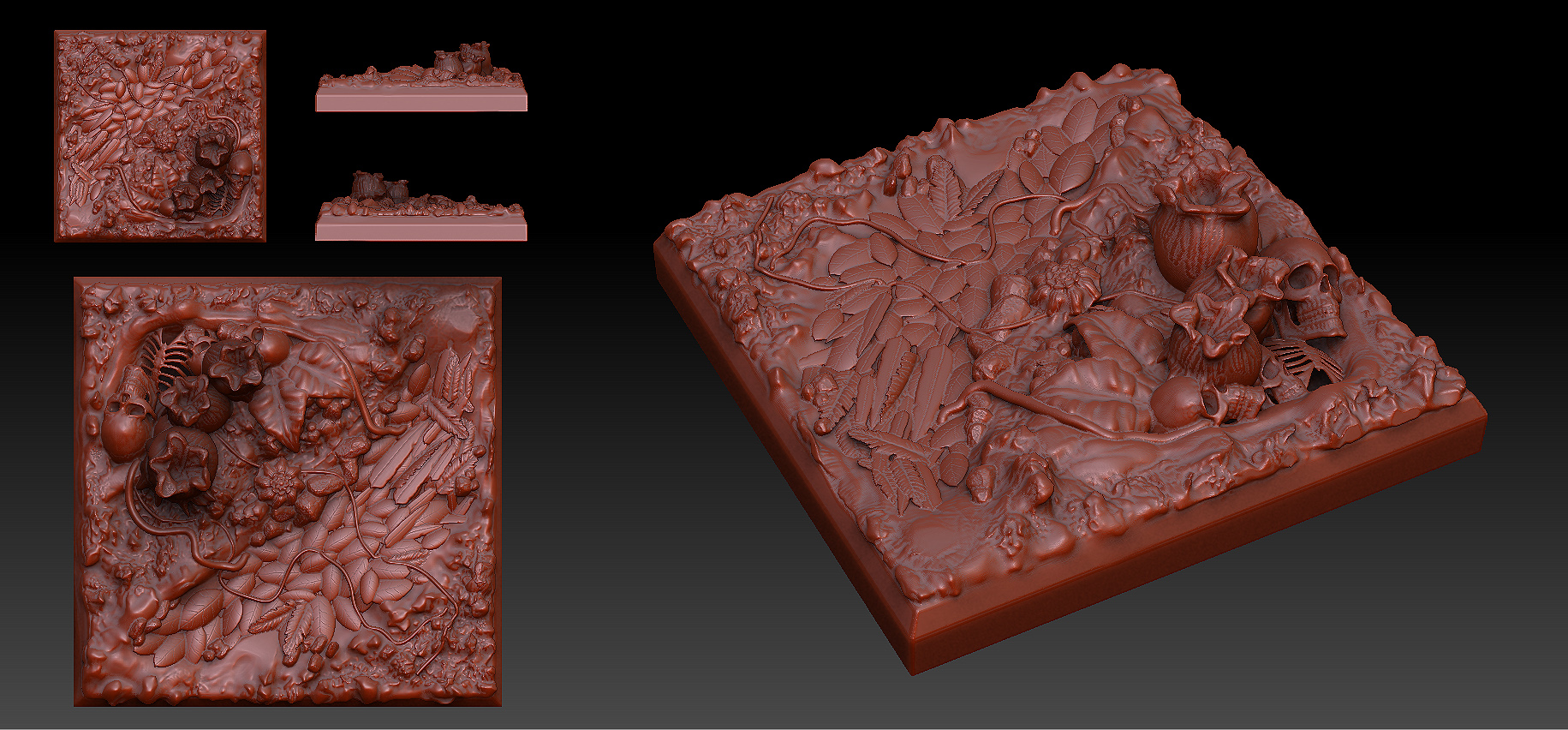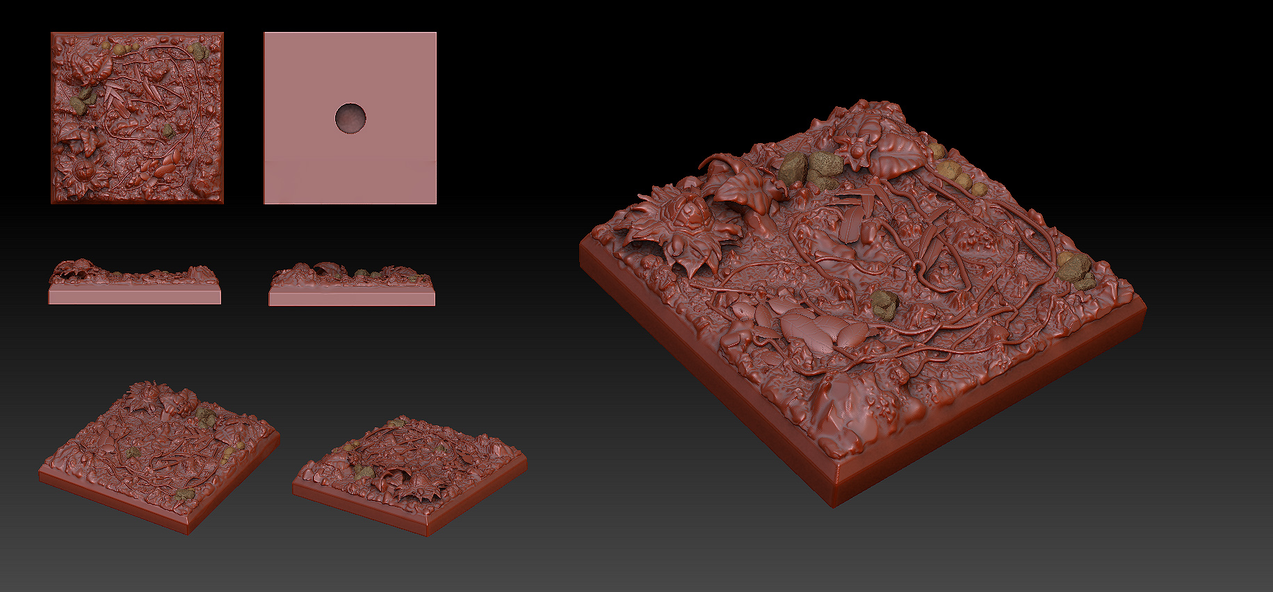 So I thought to invest some time in creating IMM’s with various objects like grasses, mushrooms, stones, frogs, plants etc…everything Jungle-esque… This took me approx. 6-10 hours of work. That’s including making the 3 bases in modo and refining them in Zbrush and filling them with various plantlife etc. That might seem like a lot but I can reuse a lot of it. The other size bases, the remaining 6, were ALL done in 3 hours tops! So I would say that’s a huge timesaver! Fun-fact: client asked mid-proces to have certain sized hole at the bottom of the bases. People put tiny magnets in them so they can group a whole bunch of them on a plate and it won’t move, or it will be moved as a whole.