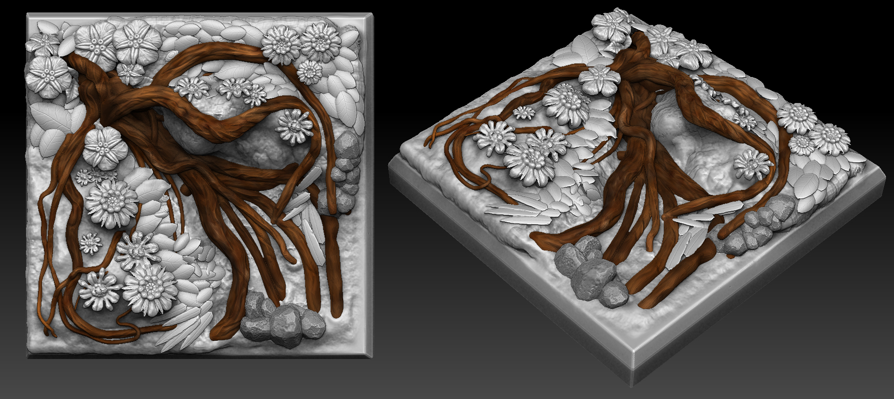Normally I would sketch some stuff out on a piece of paper but here I thought it would be cool to see if I could come up with some fast workflow so it would also save me time. So I looked up lots of references, I got some generous sample bases from the company (for which I’m very thankful, cool stuff!!) and with that I got some ideas of where to go with this. I figured I would make some “Insert Multi-Mesh Brushes” or IMM for short, in Zbrush. The way this works is fairly simple: you create a model, let’s say a flower for example. You make it low-poly but detailed enough. You make another bunch of models/meshes in the same space. After that you hit a button and voila, with one key-stroke you have instant access to different models which can add in a instant to your existing model! Imagine having a bit land or grass and just plopping flowers, stones etc everywhere just like that