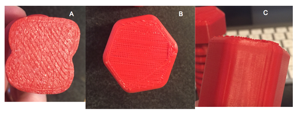 Just getting started with my Mini. My first print (A) was using the included masking tape coated with a layer of glue stick adhesive, resulting in a nice base layer.