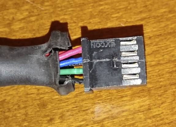 With the side with four wires facing up and the wiring harness pointing to the right (so the extruder head is to the left), the order of wires in order from farthest away to closest to you should be pink/red, blue, green, black. See photo below.