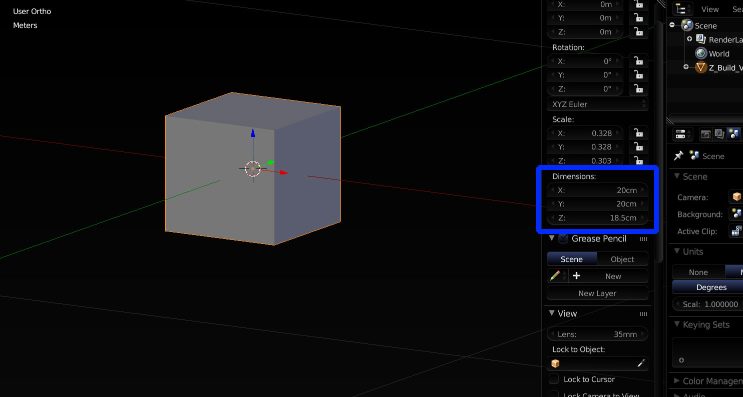 So in my attempt to model and print in real world dimension/scale. I thought to create a reference model. I inserted a simple cube scaled to the exact build volume of the Zortrax M200, which by the way is 200x200x185mm or 20x20x18.5cm