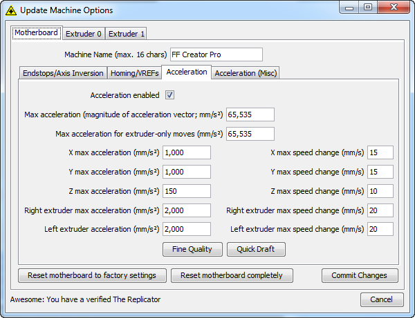 BTW, those option are the EEPROM I was talking about. Your software just has a nice interface for you to change them. Does “RepG” display the gcode that is being sent to the machine? If so you should notice that when you change those settings it’s actually just sending the gcode that I listed above. Sorry if that caused confusion.
