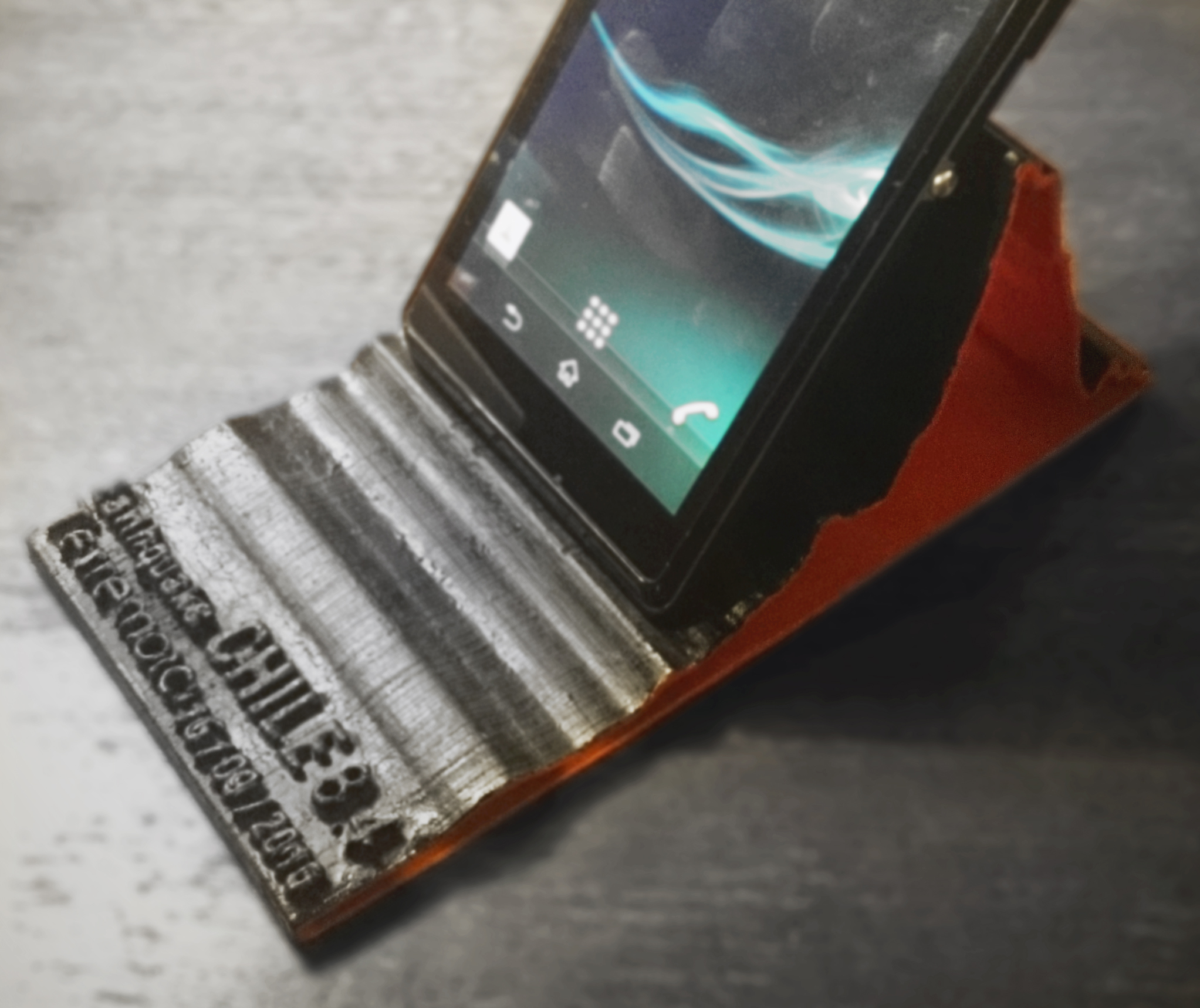 In honor of all the Chileans killed and injured by the earthquake, and all those who lost their houses and jobs, I designed a desktop stand for smartphones reproducing the Relative Moment Rate Function of the earthquake. It describes the rate of moment release with time after de earthquake origin, relative to the peak moment rate (7.22e+26 dyne-cm).