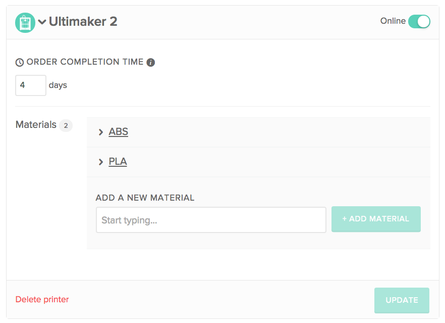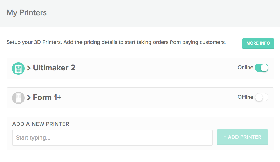 First, have a look at your printer overview on “My Hub” or directly https://www.3dhubs.com/my-dashboard/hub/printers. Here you can check which of your printers are currently online, toggle on/off, or add printers. For this example, let’s look at my Ultimaker 2