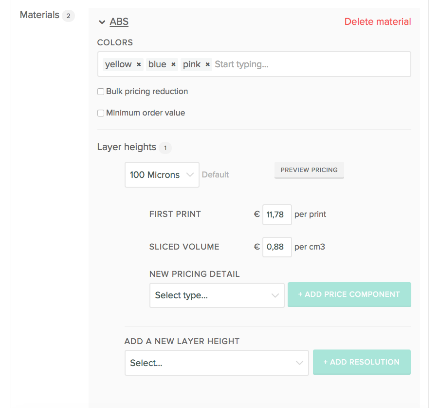 Moving on to Layer heights. You can set multiple layer heights per material, pricing them each individually. Key here is to set the right expectations, don’t set a resolution which you cannot deliver. The coolest thing to focus on here though is the New Pricing Detail setting. We’ve added quite a few options, which , depending on your kind of printer are vital for accurate pricing.