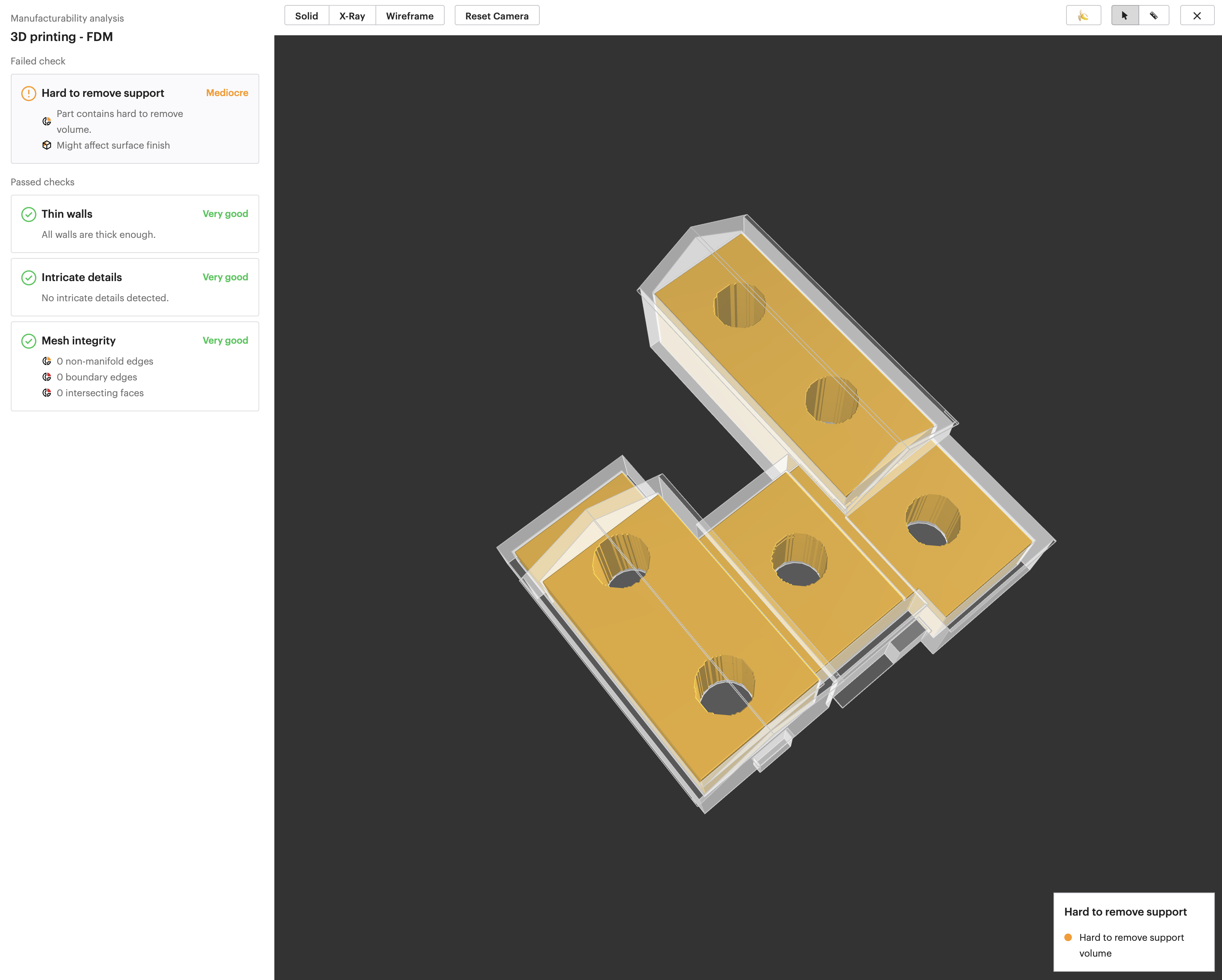 This is my first 3D printing project (and first 3D modeling attempt) and when I am going through the process on 3D Hubs to order, I come across this issue in the manufacturability checks: “Hard to remove support. Part contains hard to remove volume. Might affect surface finish.” with a grade of “Mediocre” as you can see in the attached image.