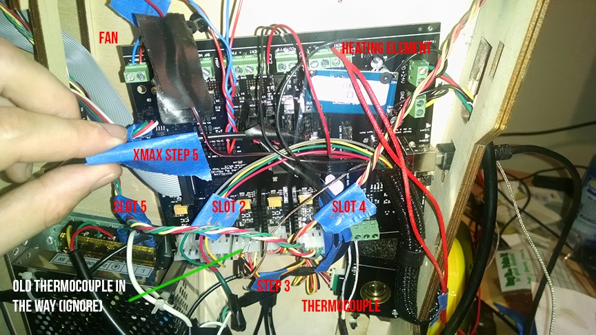 So weeks go by and my new parts come in the mail. I get a new thermistor, heating element, heater blocks, and nozzles. After I install the new parts, I power up my makerbot, and the thermistor wire starts smoking. I turn it off. Oops too late. I’m pretty sure I fried my motherboard, because from then on, the heating element error comes up, something along the lines of “heating error, heat not detected, check wiring”. So I get ANOTHER new thermistor, and try it. This time, the wire did not overheat, but I still get the same error.