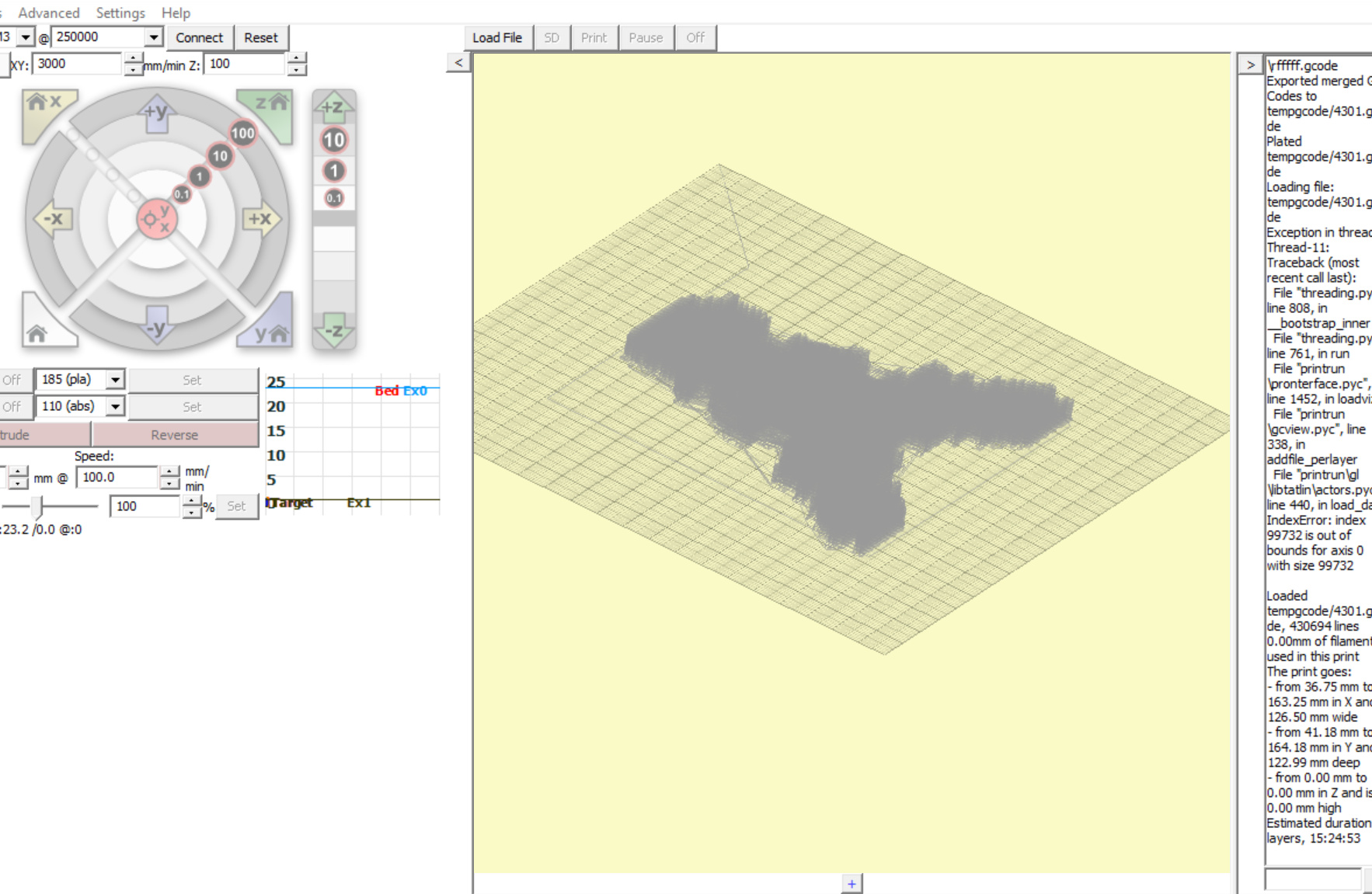 Hello, I’m trying to print something with a lot of over hang but I’m having trouble with doing supports. I sliced the object using ReplicatorG and everything appears fine when using that program but when I try to use the Gcode in Pronterface and Repitier it doesn’t appear. Upon viewing the print path in Pronterface I can see the item but it doesn’t work. I checked it out in both programs under a few different settings and it appears to be flipped on it’s side as if I was trying to print horizontally instead of vertically. Anyone know how to do supports differently/fix this?