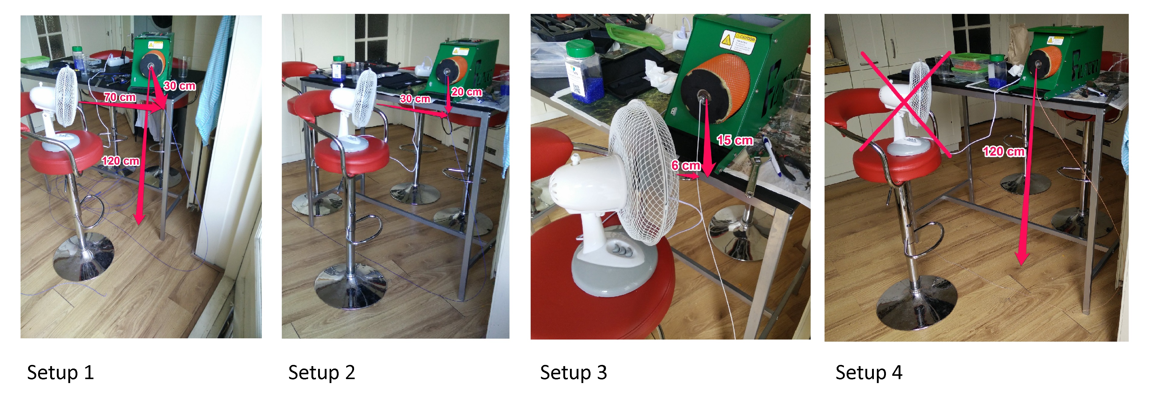 In total I used four different experimental setups that you can see in the image below. The only thing that varies is the position of the fan. For setup 1, 2 and 3 the 30W fan is used at half power. In setup 4 the fan is not used. In all setups the nozzle of the Filabot is placed 120cm above the ground.
