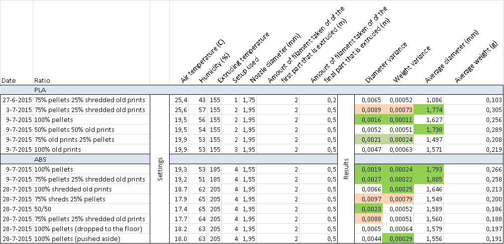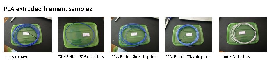 - The first part and the last part of the filament extruded for each sample are discarded. The first part might contain a different material mix due to the transition and it might have been pulled down differently since there is no filament ‘beneath’ it. The last part might also have been pulled differently since it hasn’t been fully cooled when the process is stopped.