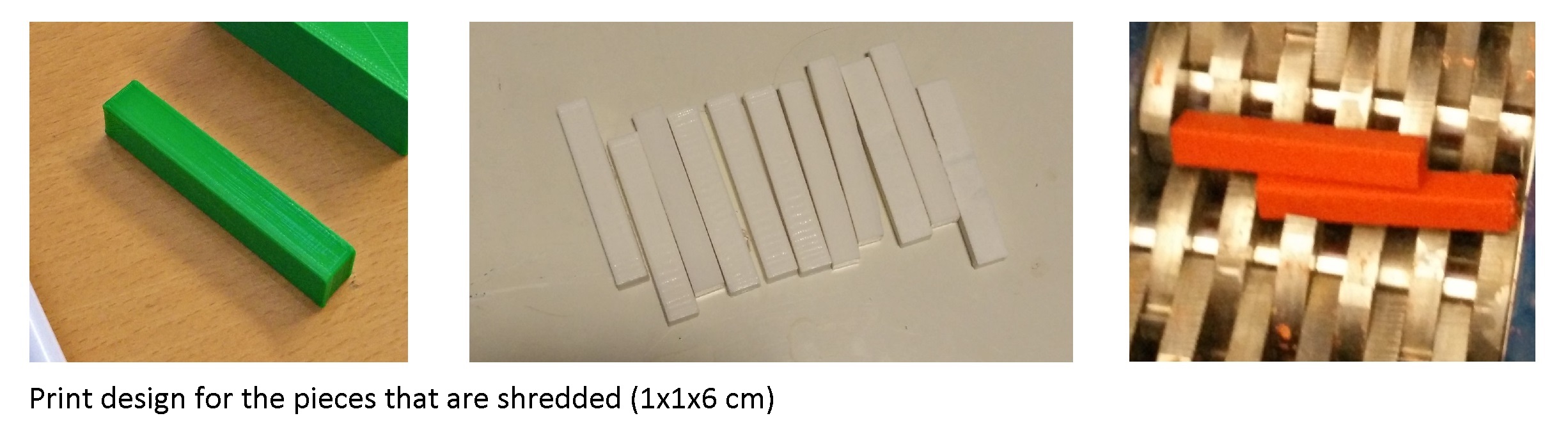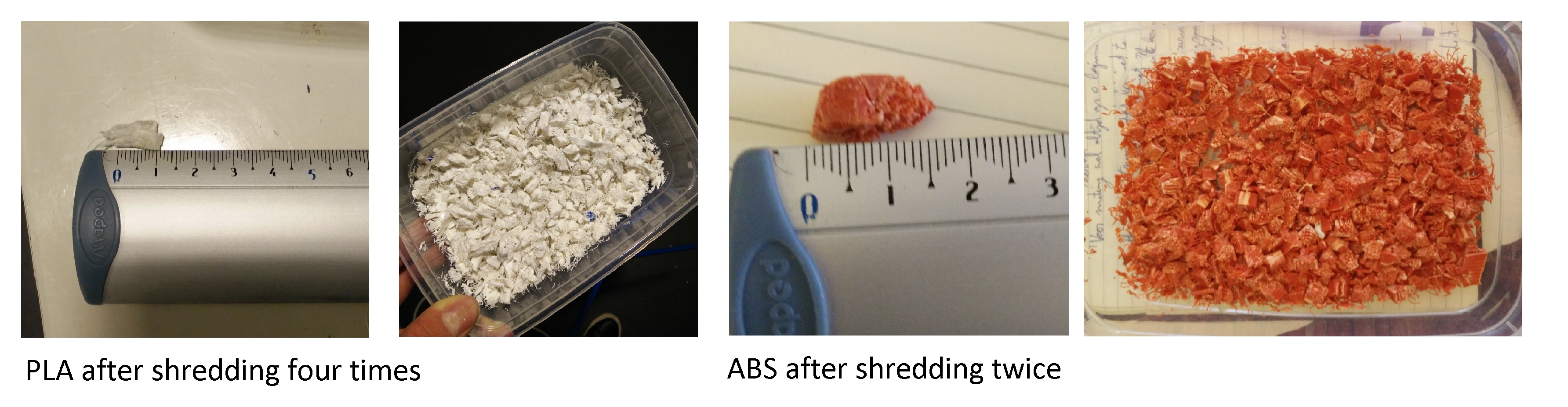 After two rounds of shredding the ABS blocks the largest pieces also had an average diameter of about 1,0cm. This difference is probably due to the fact that the ABS prints often failed halfway through the print causing the initial pieces that were fed into the shredder to be smaller.