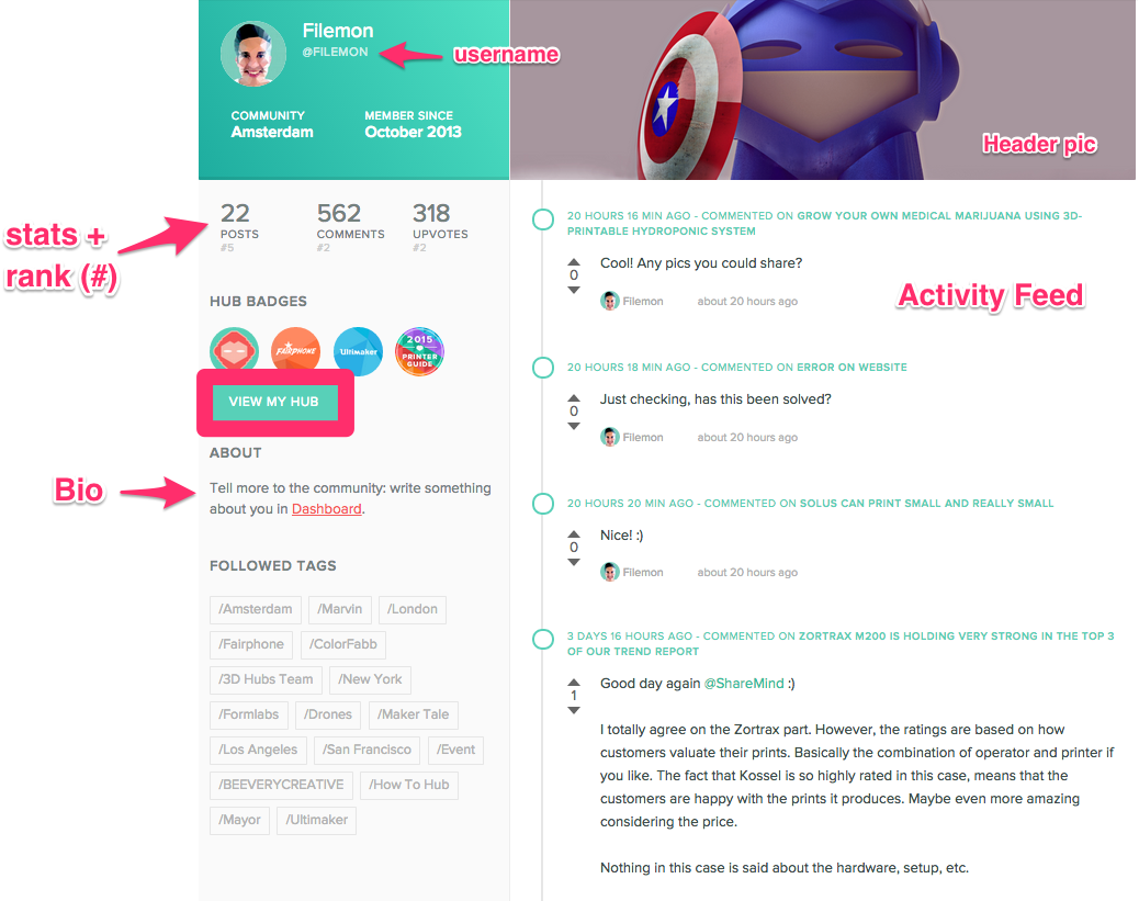Once you sign up to 3D Hubs, you’re online identity is represented in a user profile. This sums up your activity on the 3D Hubs platform and includes: