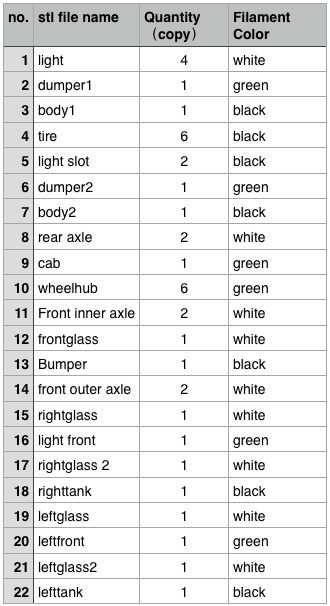 There are 4 main parts to be used: left front .stl, right front .stl, bumper .stl, body1 .stl. After that, we can add the cab onto it.