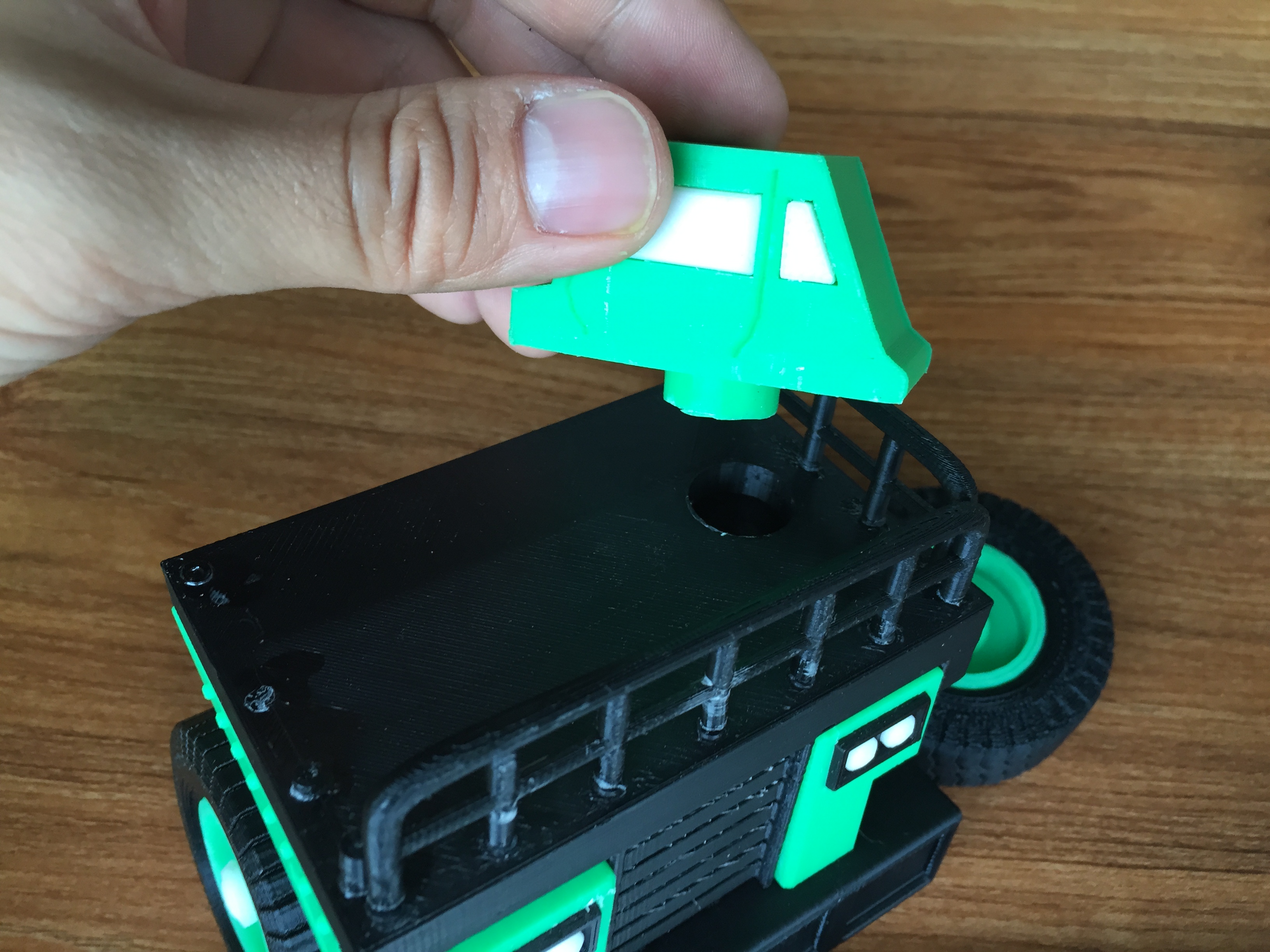 There are 5 glass widget to be put on the cab. Each has an individual stl file. The cab could be assembled easily.