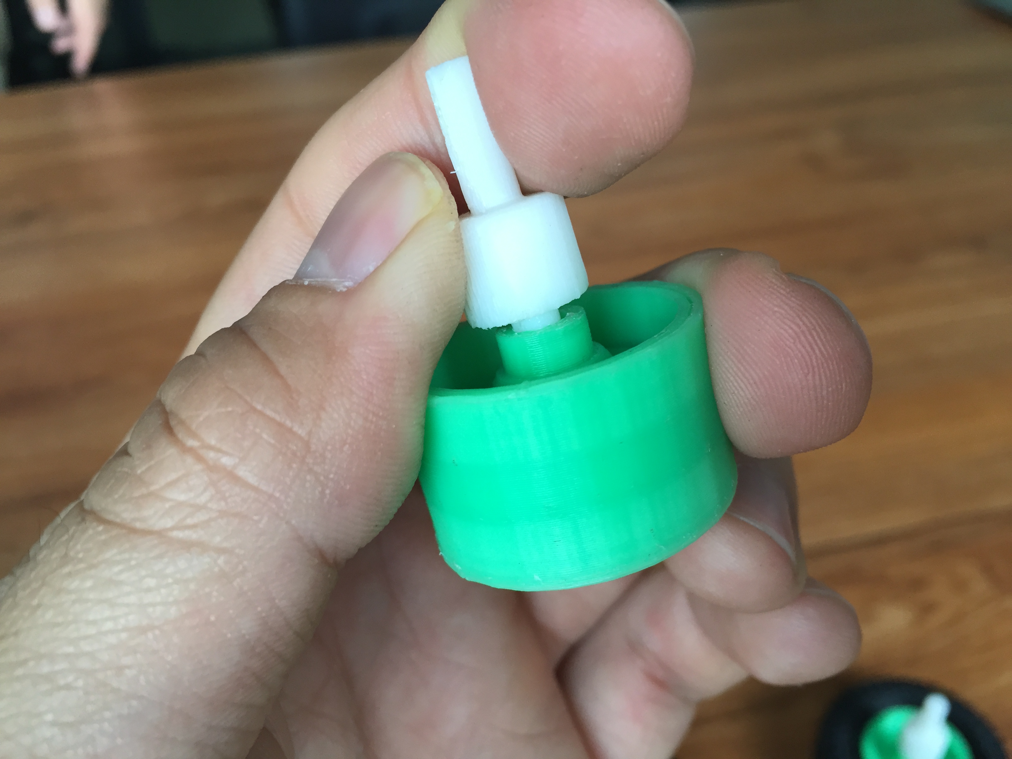 Insert front outer axle through the wheel hub, and into the inner axle. You may need some glue, but remember the wheel cannot be cemented.