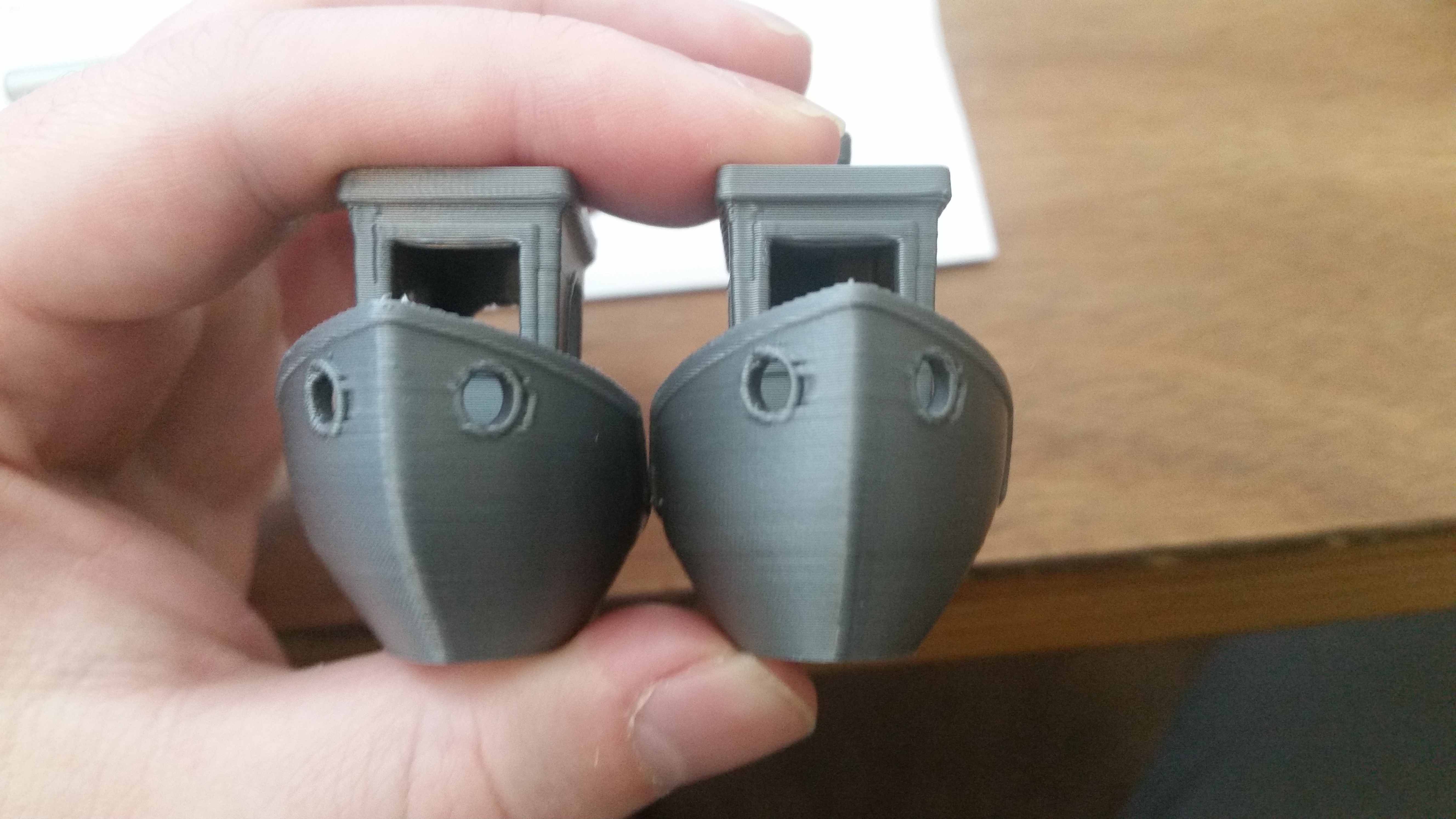 I am attempting to print bench on a Original Prusa i3 MK2 using Prusa PLA and stock Prusa PLA settings since I am printing with Prusa Silver PLA. The print turns out alright with the exception of portions of the model that stick out slightly from the main surface. For example, the image below shows the holes at the bow of the boat with indentations on one side of the model. I cannot figure out why this is the case.