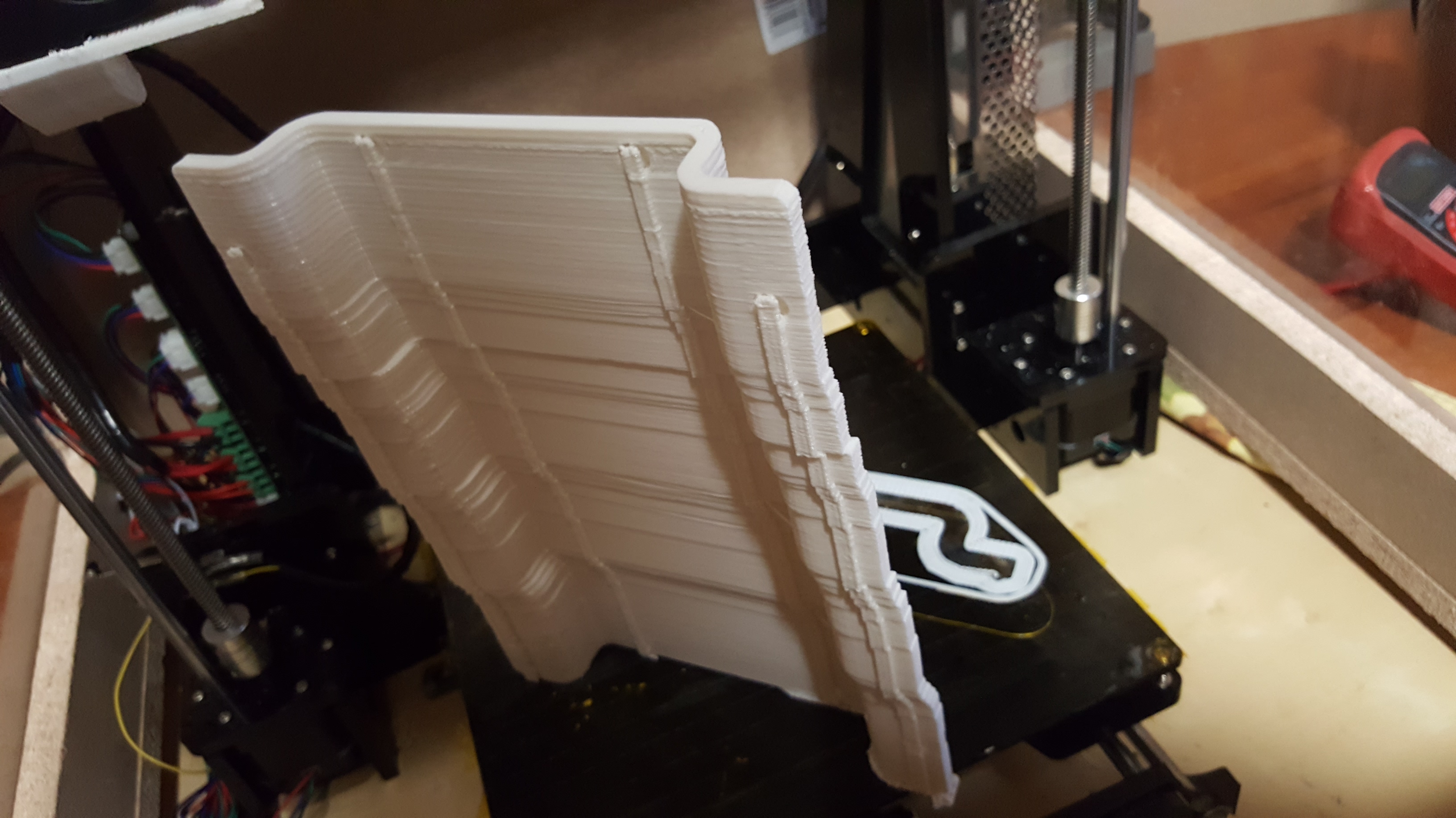 When printing something that is tall, thin and vertical, it doesn’t have enough structure to hold itself in place properly. So when the nozzle touches it the print moves in the opposite direction and layers shift all over the place. What you have to do is design in some lateral supports,that is a couple of walls that are perpendicular to the print to give it that lateral stability.They don’t have be to very thick and can be made to snap off once the print is done.