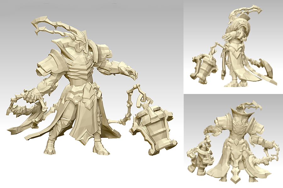 Someone asked me if I could find this character and print it and painted for him. After some search I got to find the original model of Thresh from the game I guess, because it was unposed and the mesh was clean but not closed. It took me hours and hours to pose the body and weapons in Zbrush, to separate some of the pieces like the lamp and the shoulder plates and to finally get a light mesh as nice as possible to print.