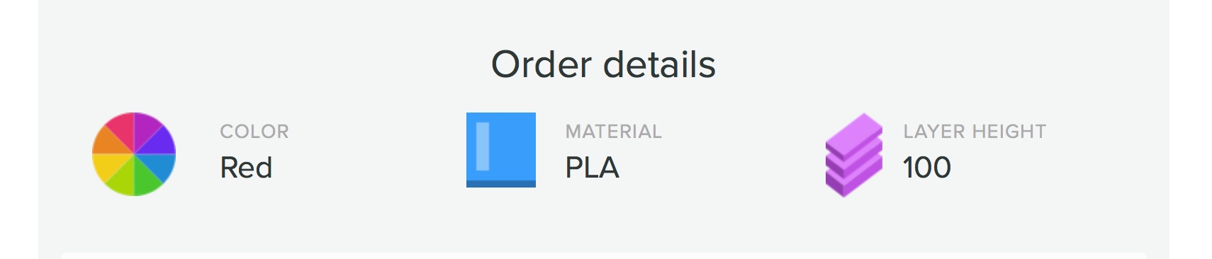 In the order page, I see the color (red), material (PLA) and resolution (100micron). The first two settings, are the ones I selected for the test but not the resolution. Then inside the email confirming the order for Mr. Marvin Senior Robot, the first instruction is: