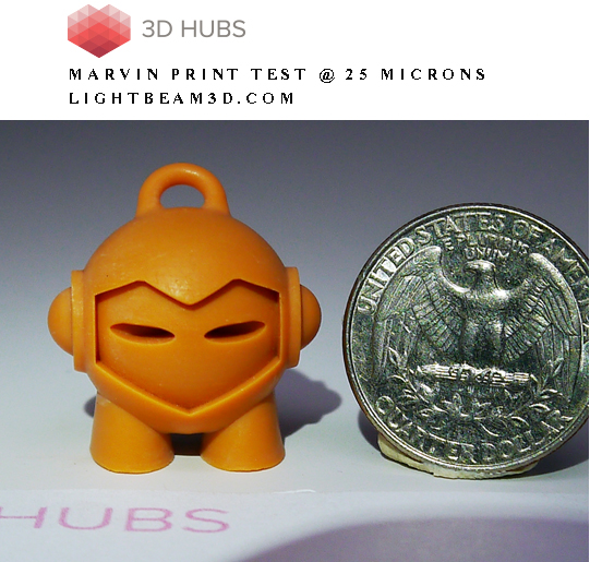 Marvin was printed out on a 25 µm in RC31 light curing resin, on a EnvisionTEC Perfactory® Mini Multi Lens 3D Printer. I print 3 3/4" figures for Hasbro at 50µm and the resolution is fine, rarely do I go to 25µm. The highest resolution the printer can print is 16µm.