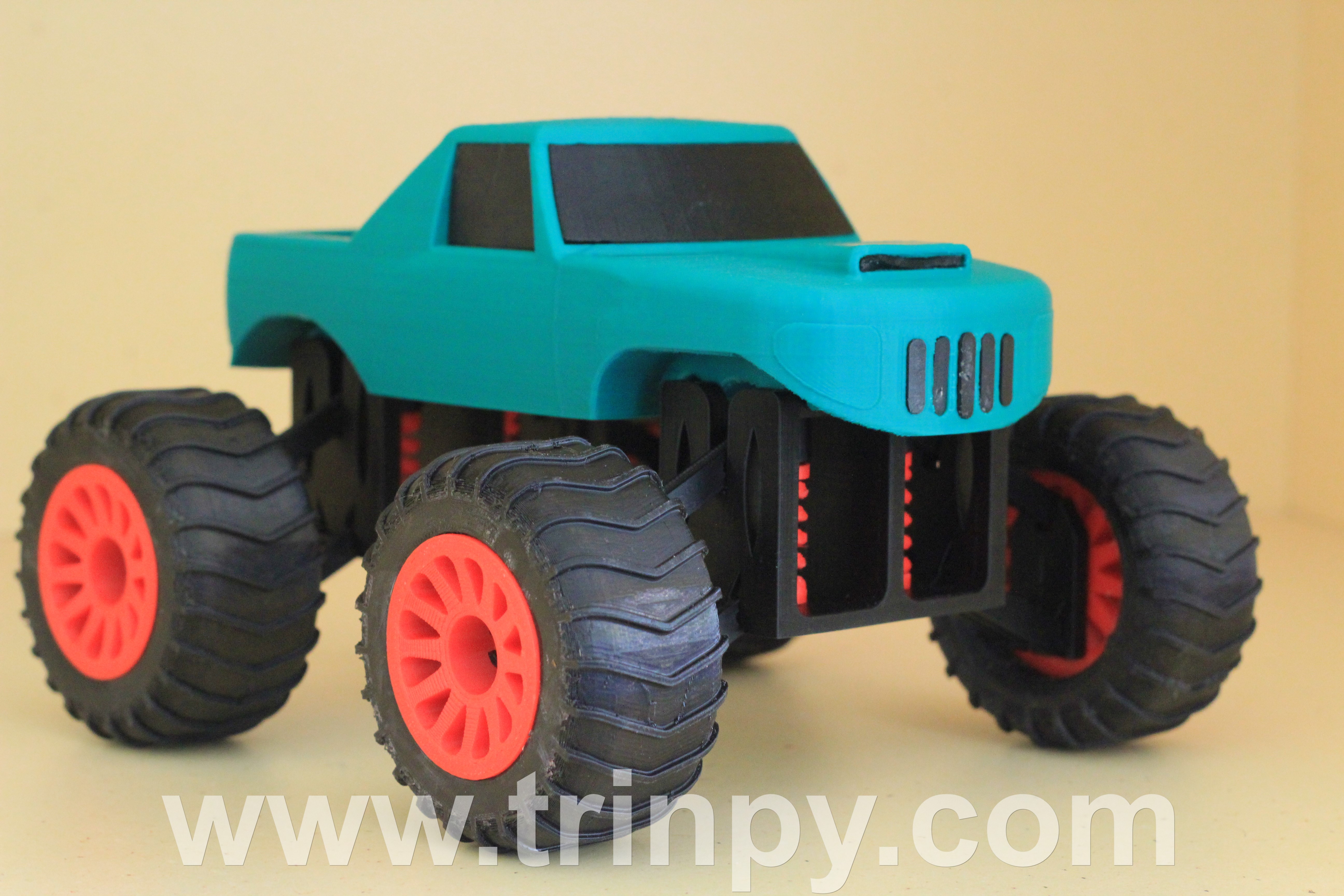 Just thought I would share my updated mini monster truck because everyone loved the last one but it was a bit too big for most people to print out! The old one was about 100 hours to print, this one is about 60 hours (with flexy tyres) or about 45 hours with solid filament tyres. This chassis can be printed on one bed (about 207mm long 93 mm wide), total size is 207mm long, 210mm wide, 130mm tall.