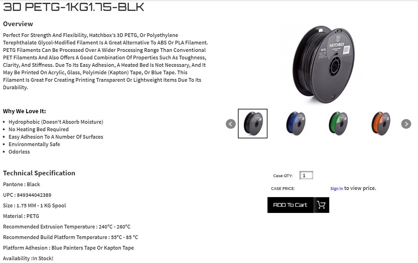 Going over to the data sheet for it, I see that it brings me to the datasheet for “Z-PETG,” something I’ve never heard of. I was not able to find a proper datasheet for Hatchbox’s PETG, but I have screenshotted their page for this product below: