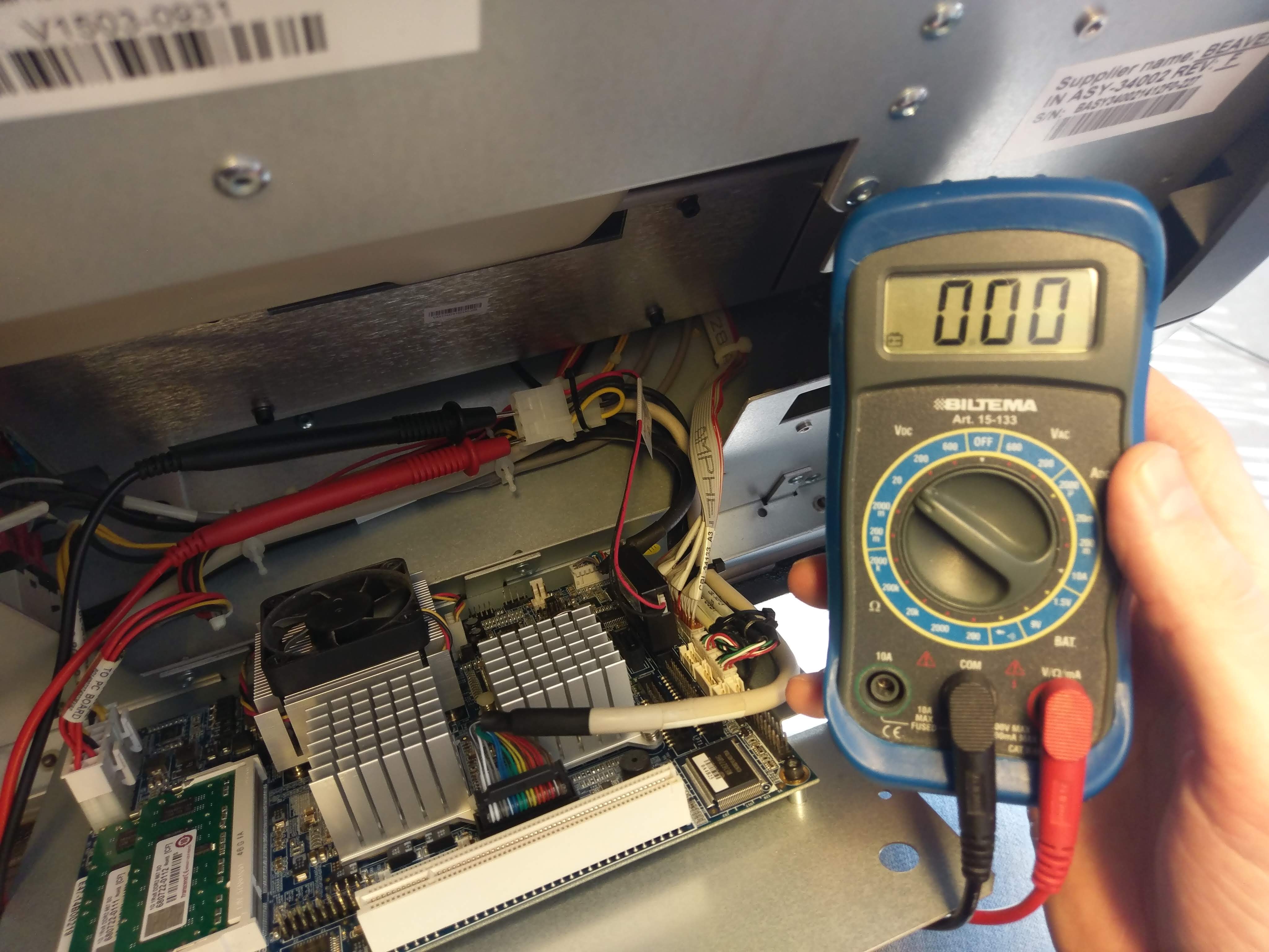 I tried with a multimeter, and it seems as if there is no power coming out of the PSU (see attached image). I also tried to check the current on the cable in top left corner of the internal pc (“to PC board”). No current there either.