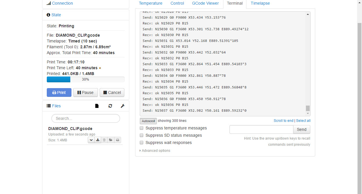 So ive been using octopi/print for a few days now and i have not uses any plugins just the basic ones that are preinstalled. Everything is up to date but what I have realized is that my prints will pause/freeze mid print for about 5-10 secs and then continue like nothing happened, this wouldnt be a problem but my prints have a small blob of sorts in the areas is freezes because it heats/extrudes existing material or new material, im not sure what the issues as certain times i get a weird long code in the terminal when it freezes and other times it nothing. Any ideas or help as to why this keeps happening, I love putting to use my raspberry pi and using this software but if these keeps happening im going to need to stop. I am using a Monoprice Maker Select 3D Mini, i have not has this issue till i started using octopi/print. Attached will be screenshots of the terminal when freeze/pause occurs.