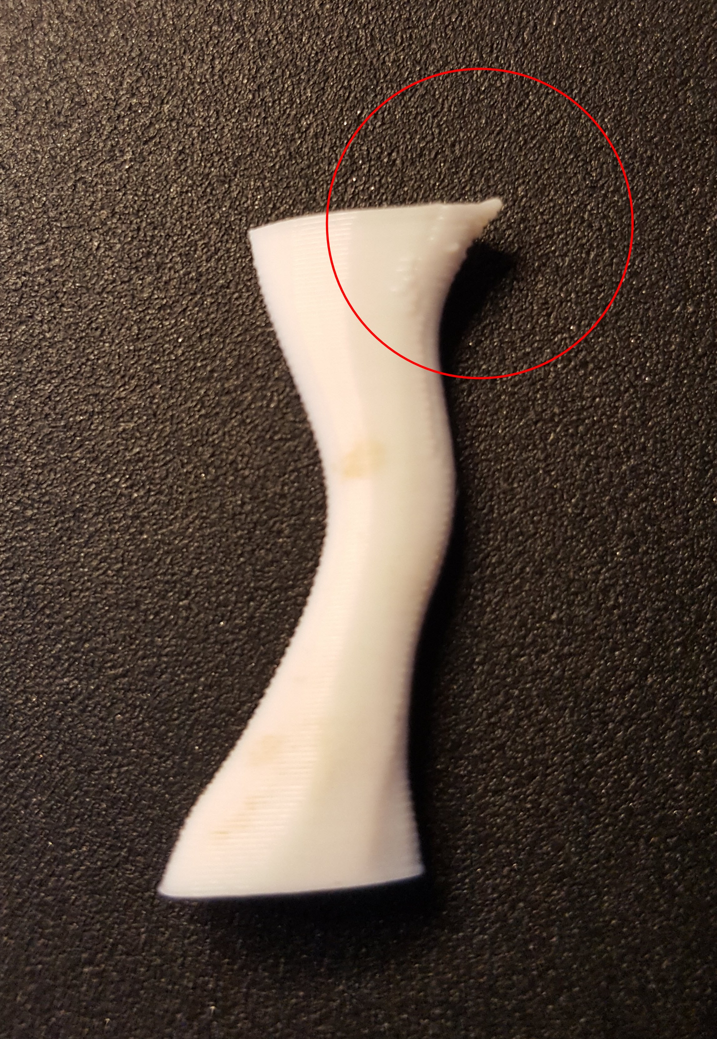 In the circled area the material starts to build up and the second nozzle eventually catches it and knocks it over. This is a start/stop point.
